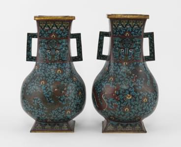Cuivre et émaux polychromes à décor de deux dragons poursuivant...