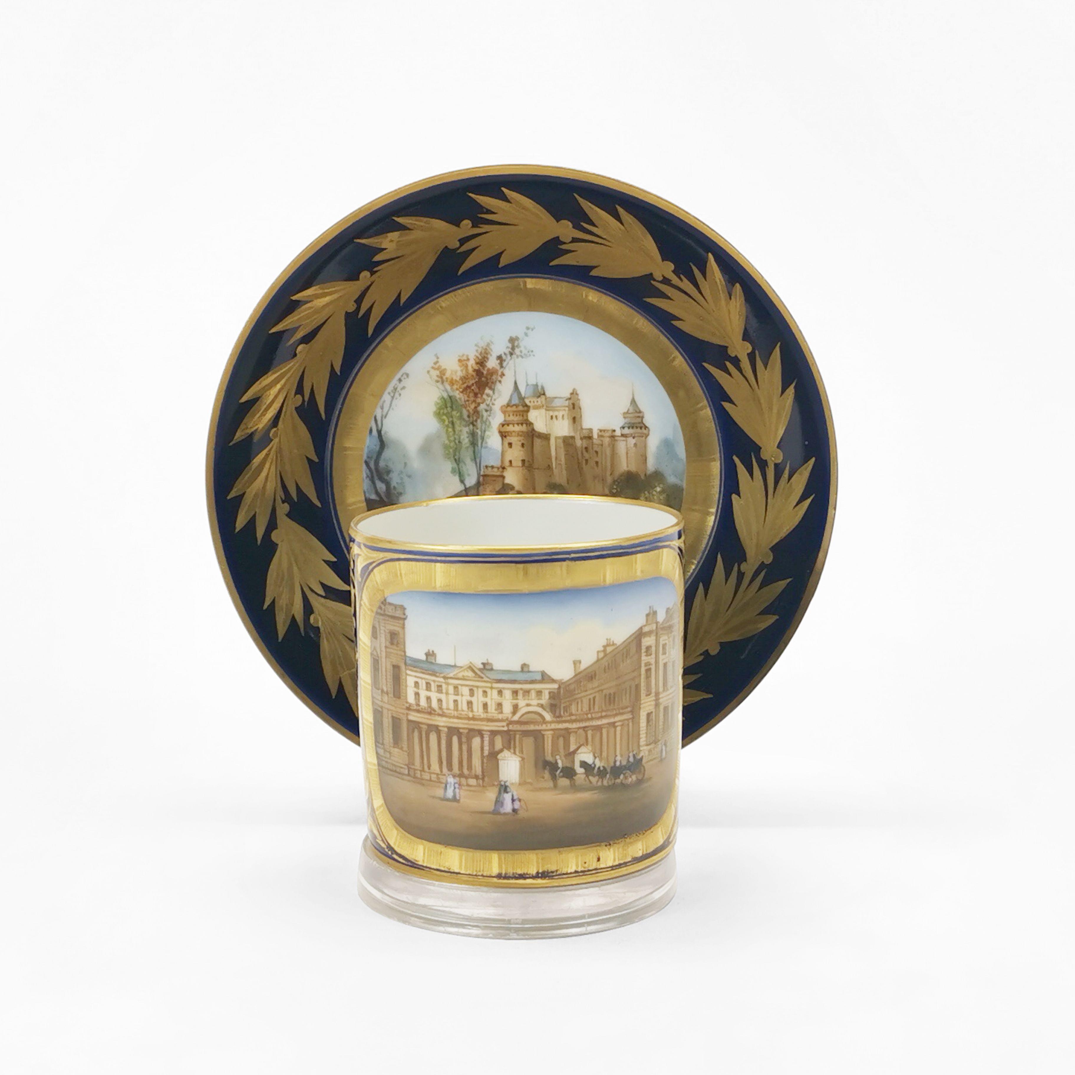 3340. Tasse à décor du Palais Royal et château de Pierrefont Pseudo marque de Sèvres, XIXe s