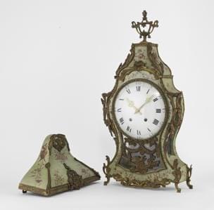 Bois laqué vert à décor de fleurs, laiton doré et cadran émaillé...