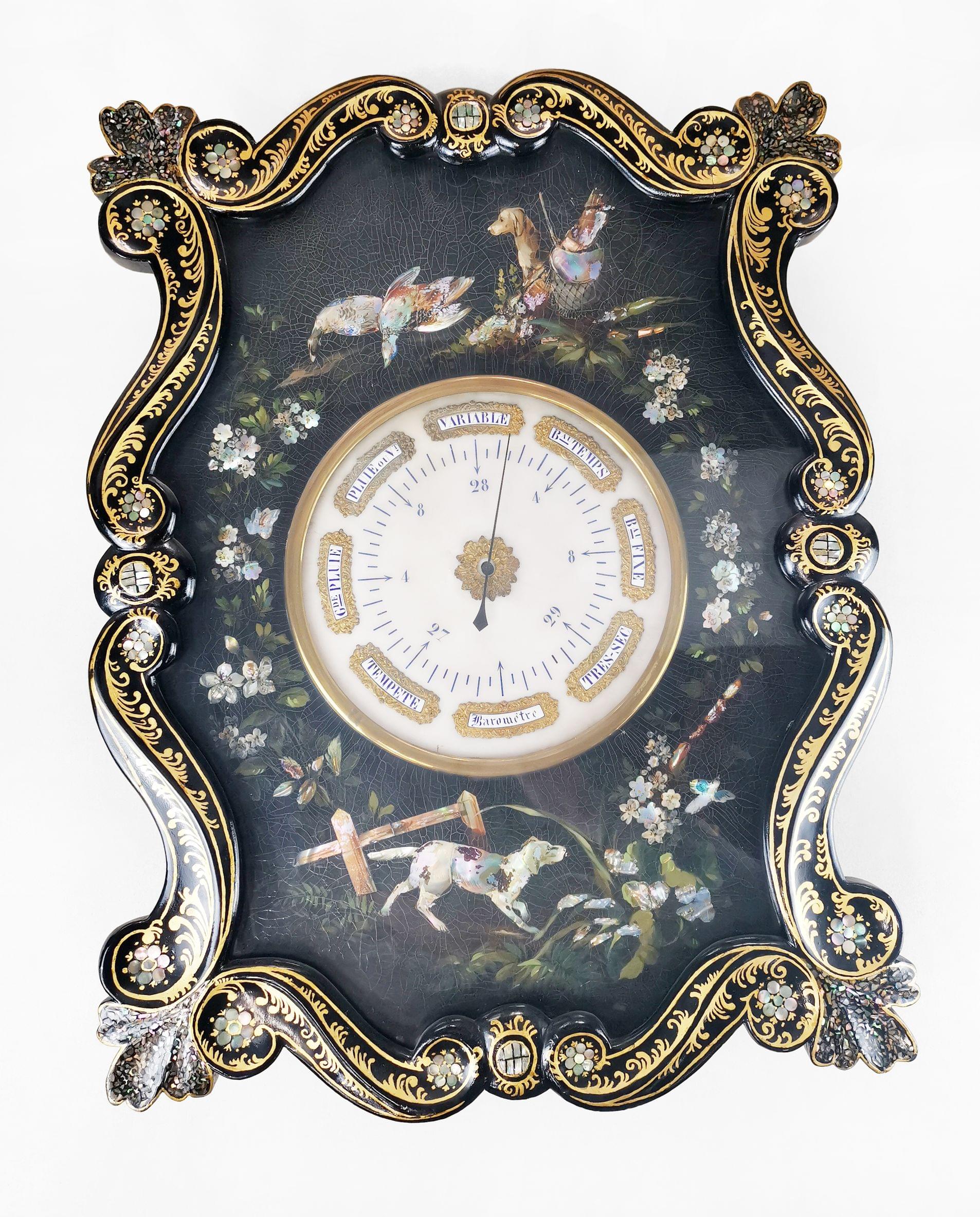 Cadran en marbre, émail et métal doré, caisse en bois noirci peint et inscrusté de nacre à motif d'animaux, 66x50 cm