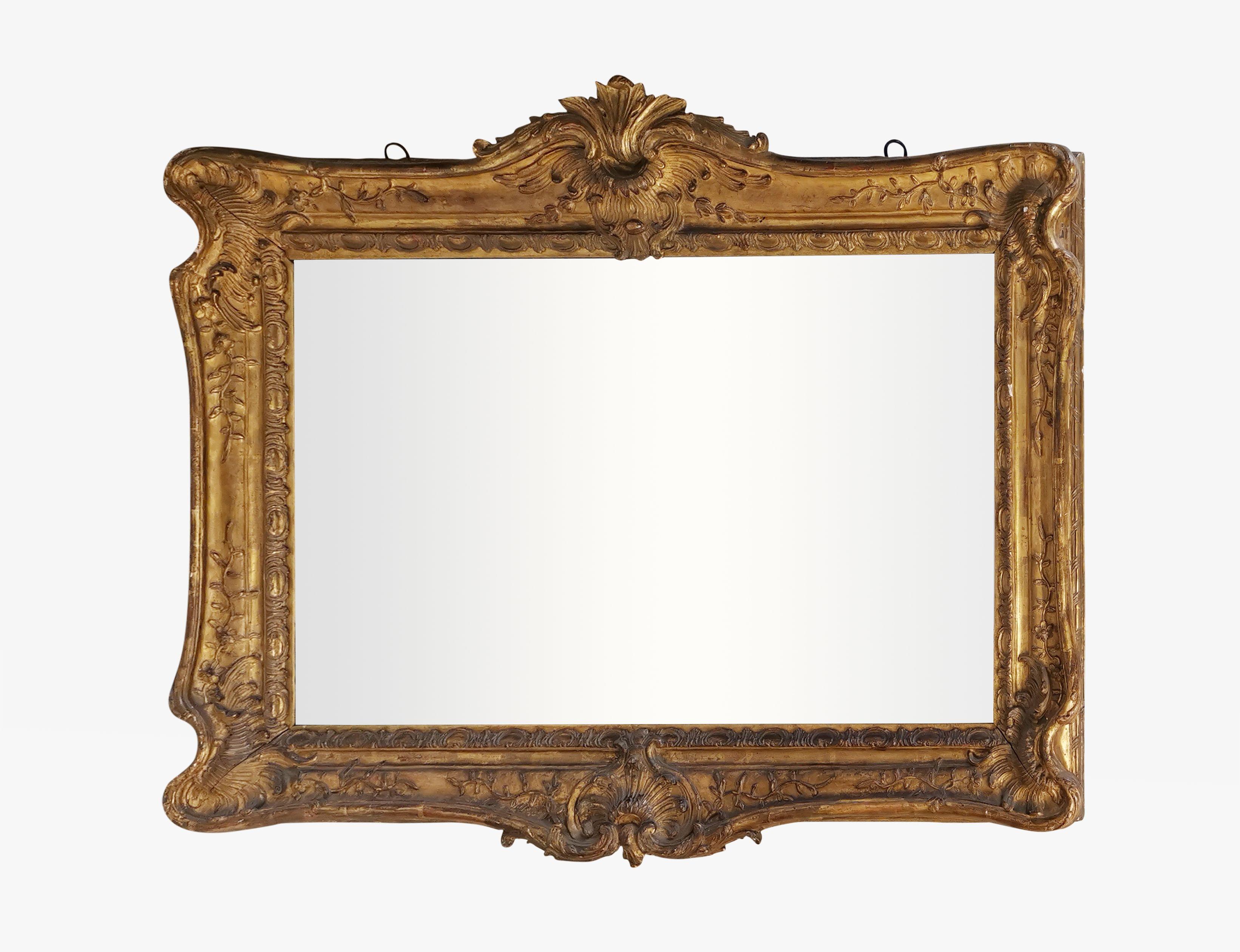 Bois sculpté et doré à motifs de coquilles, enroulements et rinceaux, glace au mercure, 74x94 cm
