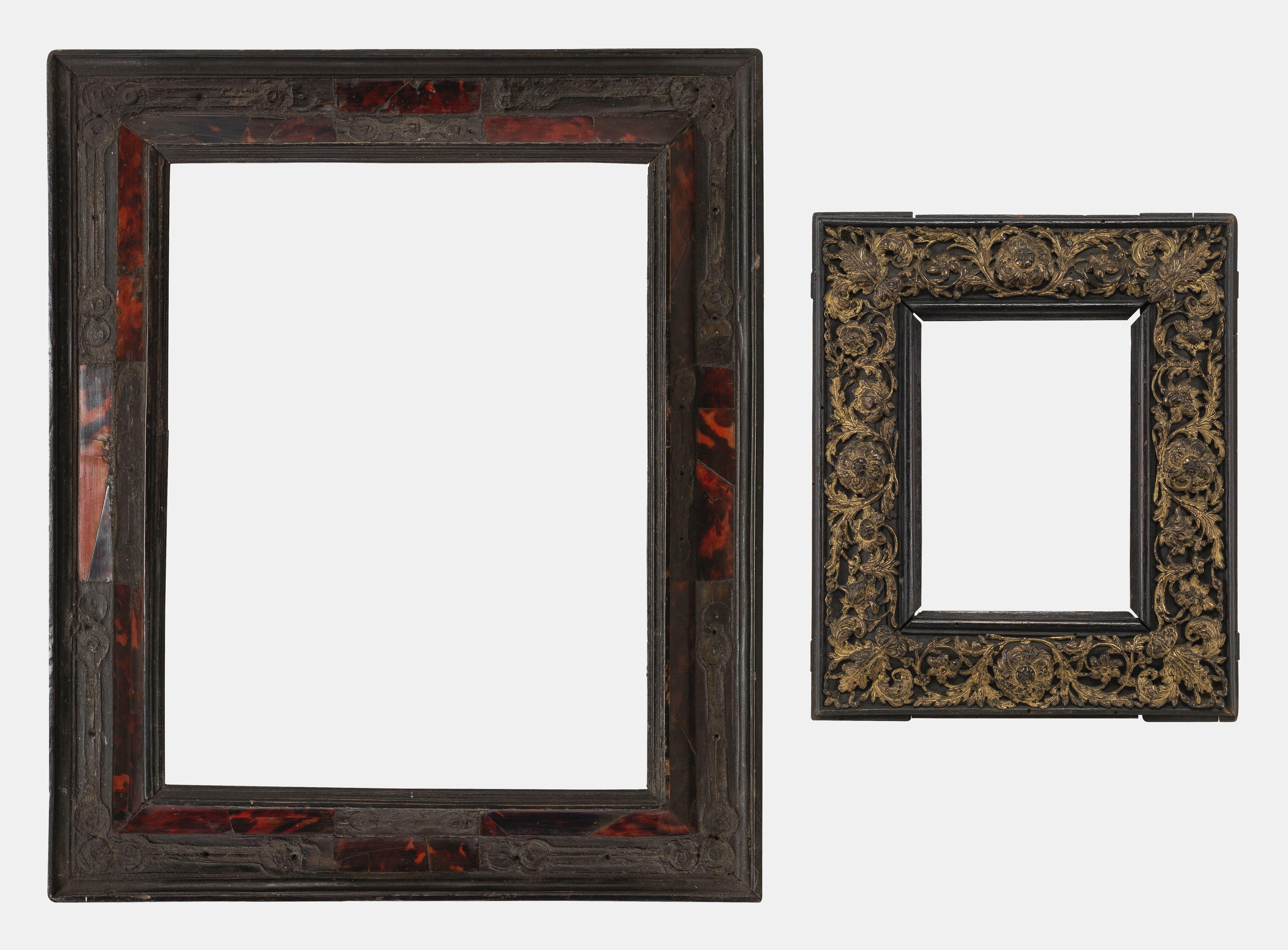 Bois noirci, l'un à décor de frise de rinceaux en laiton, l'autre d'écaille de tortue, dimension à vue 13,5x10 cm et 28x22 cm. Provenance: collection privée genevoise