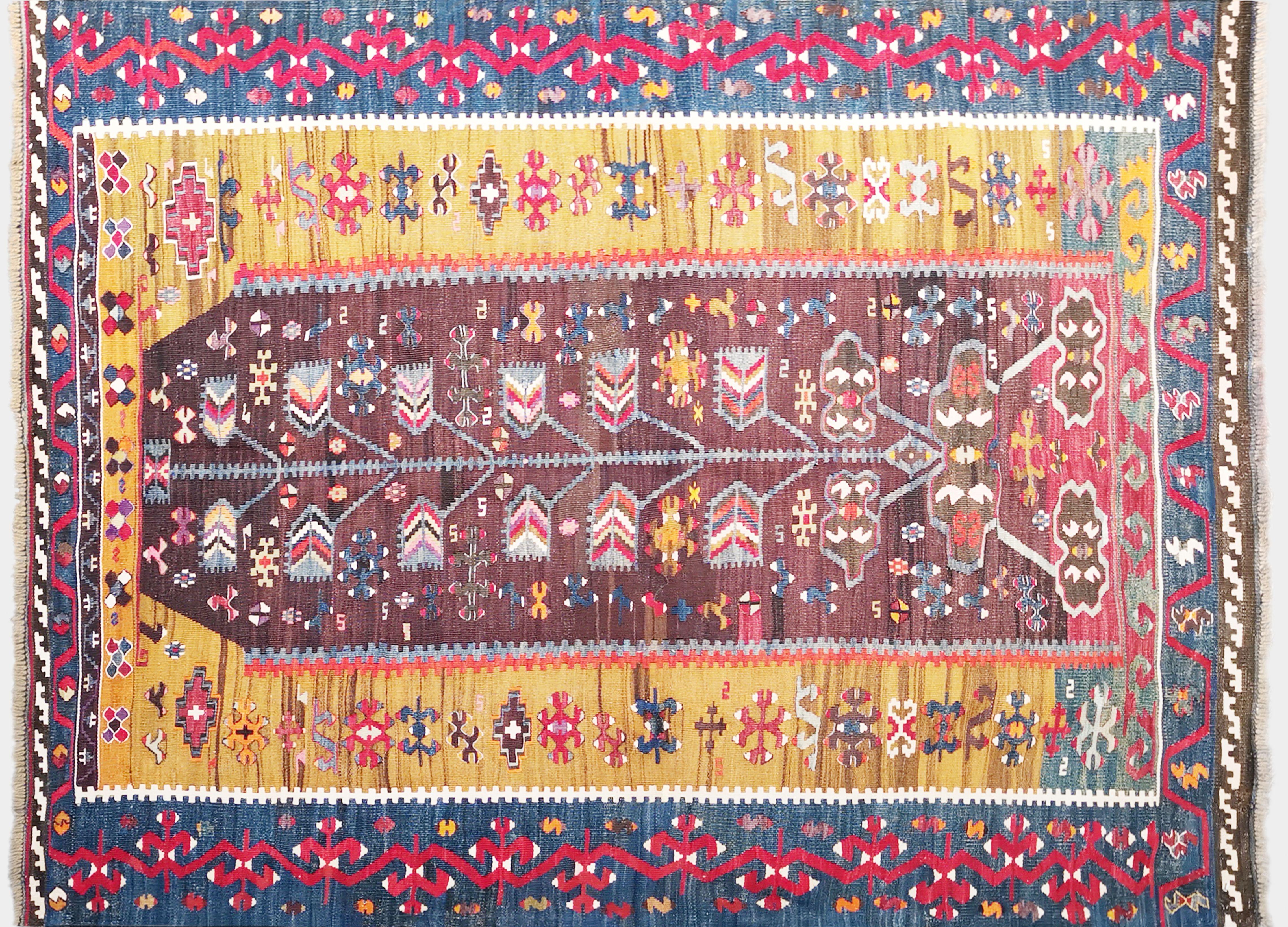 Laine à décor géométrique sur fond rouge, 323x165 cm. Provenance...