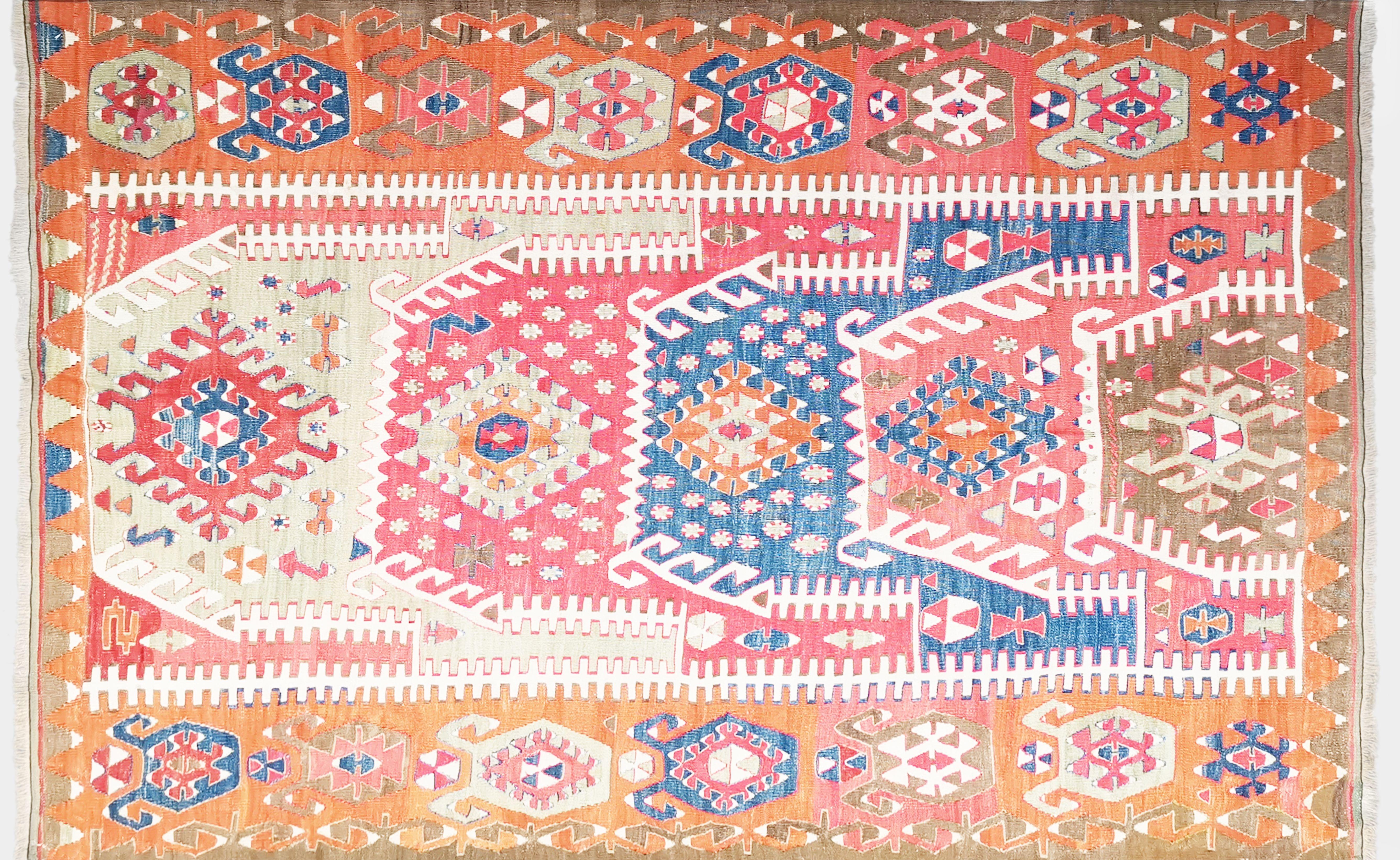Laine à décor géométrique sur fond rouge, 323x165 cm. Provenance...