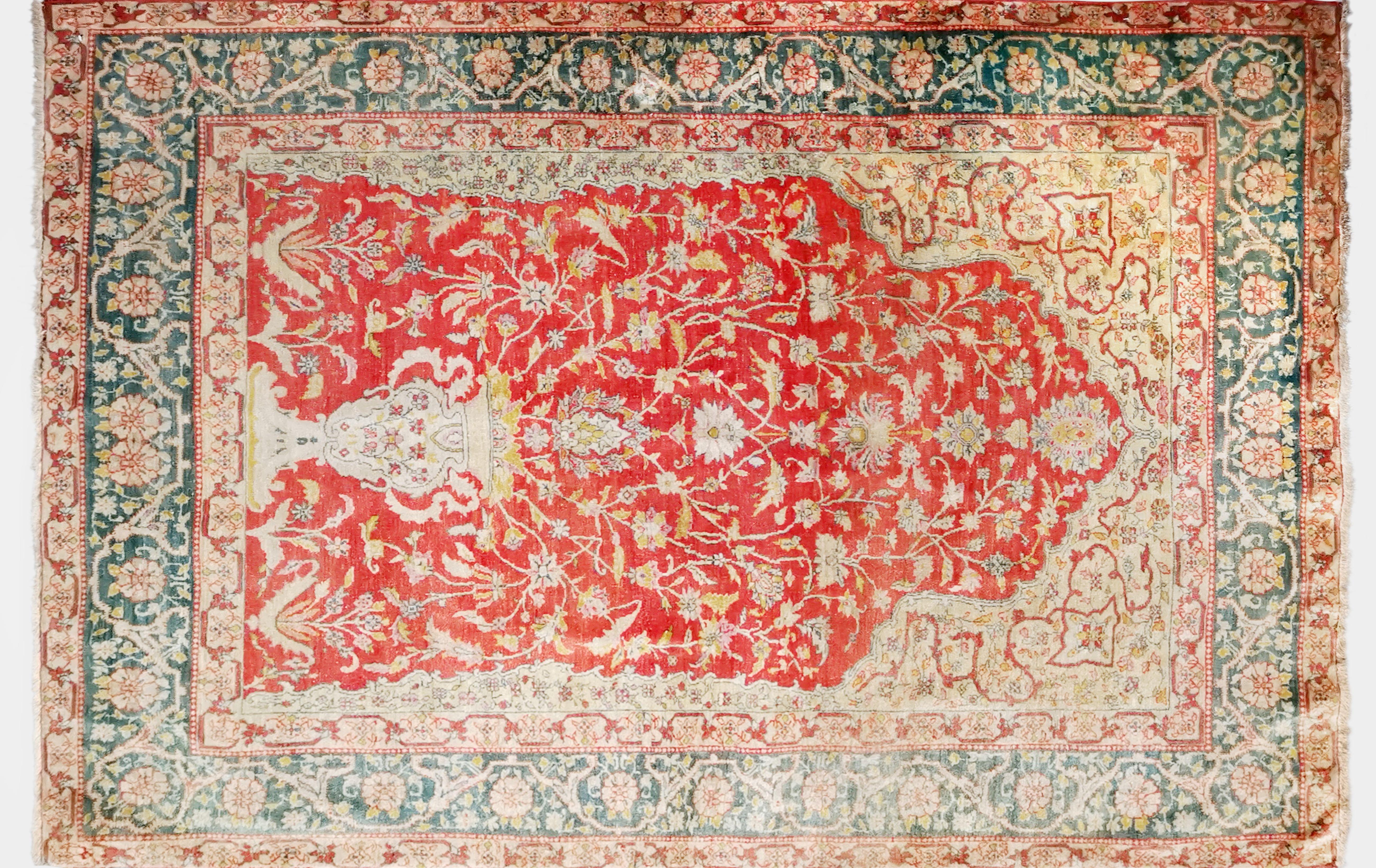 Laine à décor d'un myrhab sur fond rouge, bordure ornée de rinceaux sur fond vert, 195x136 cm