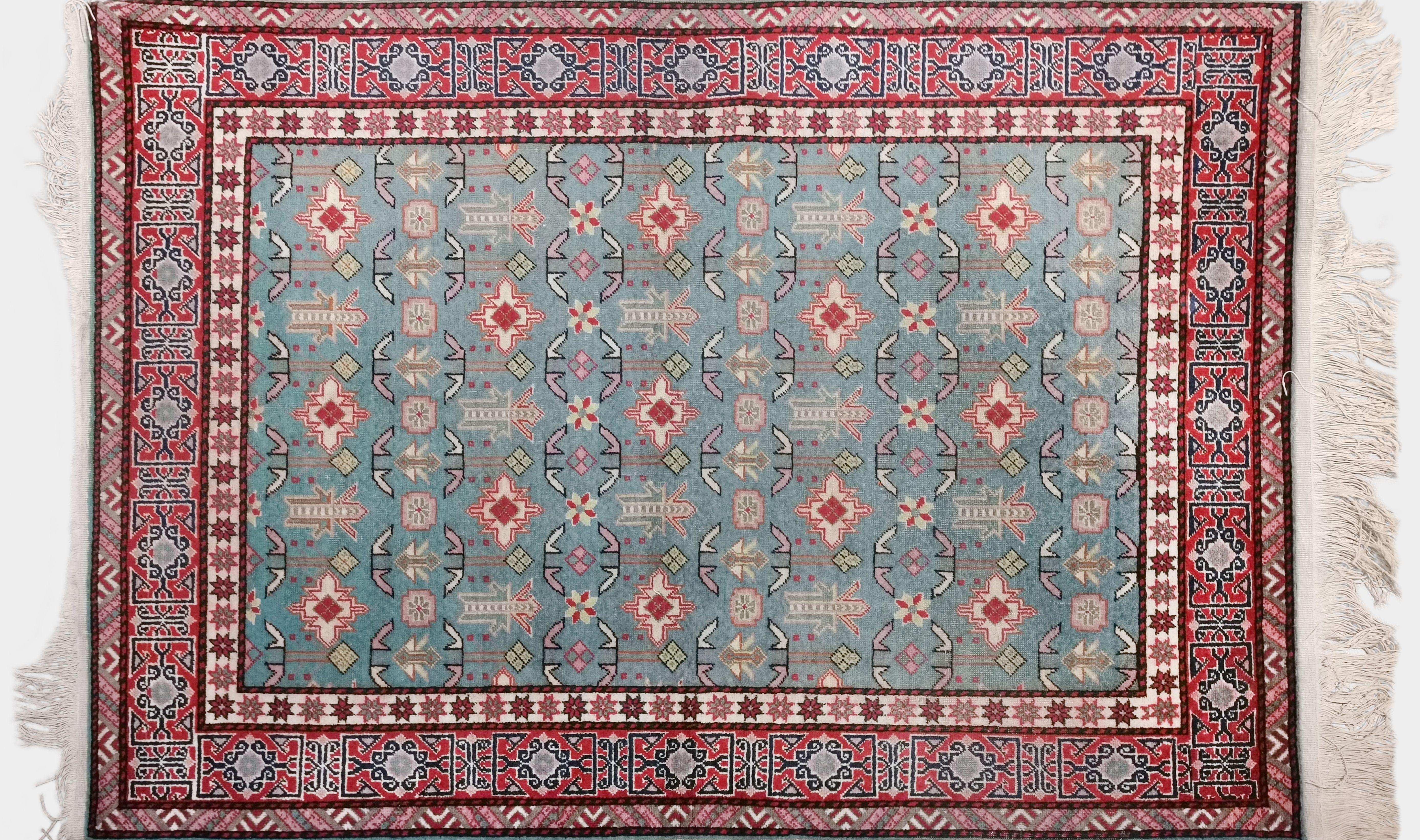 Laine à motif stylisé sur fond bleu, bordure sur fond rouge, 168x116 cm