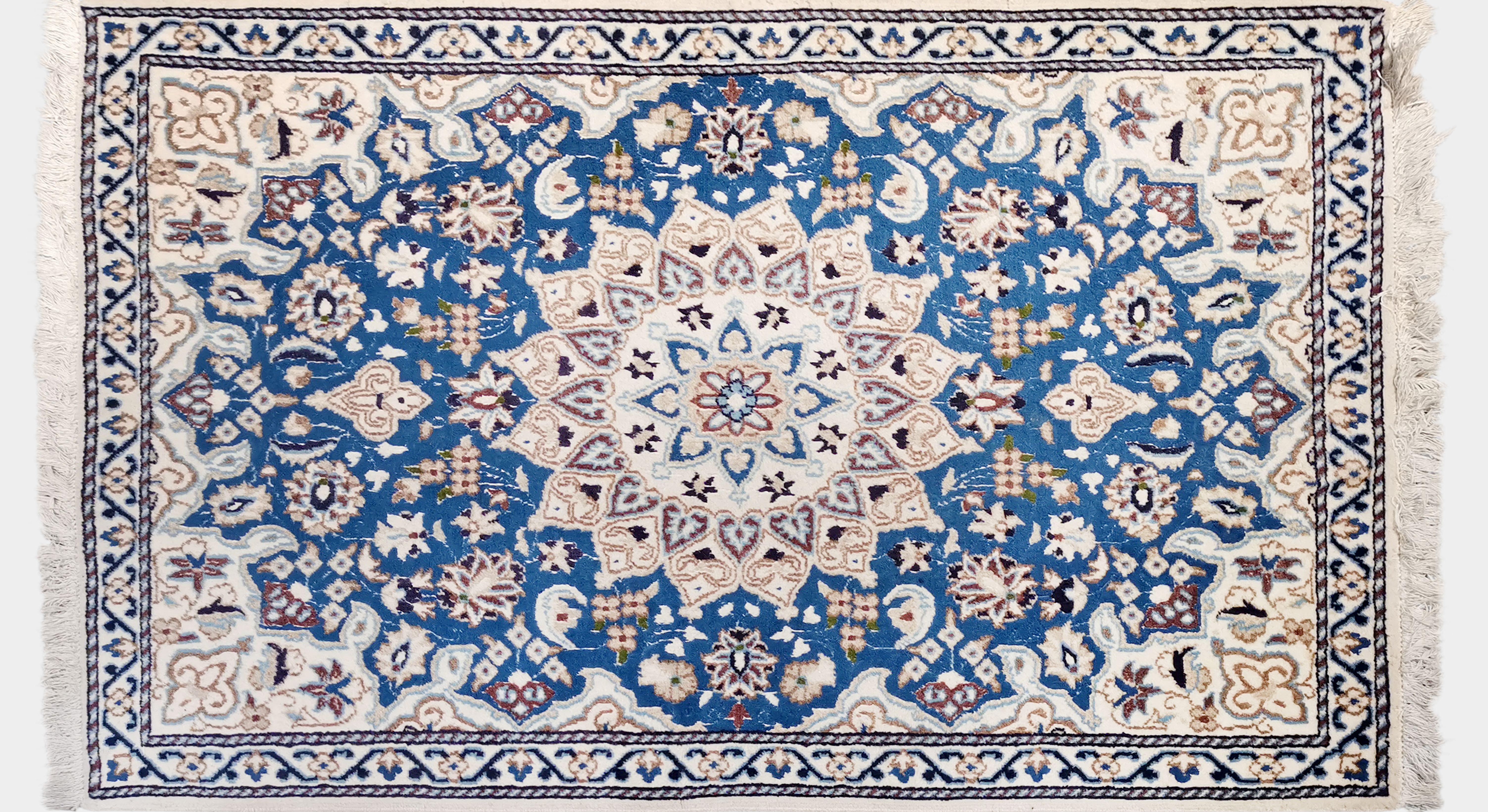 3640. Tapis de prière, à décor de médaillon central beige sur fond bleu
