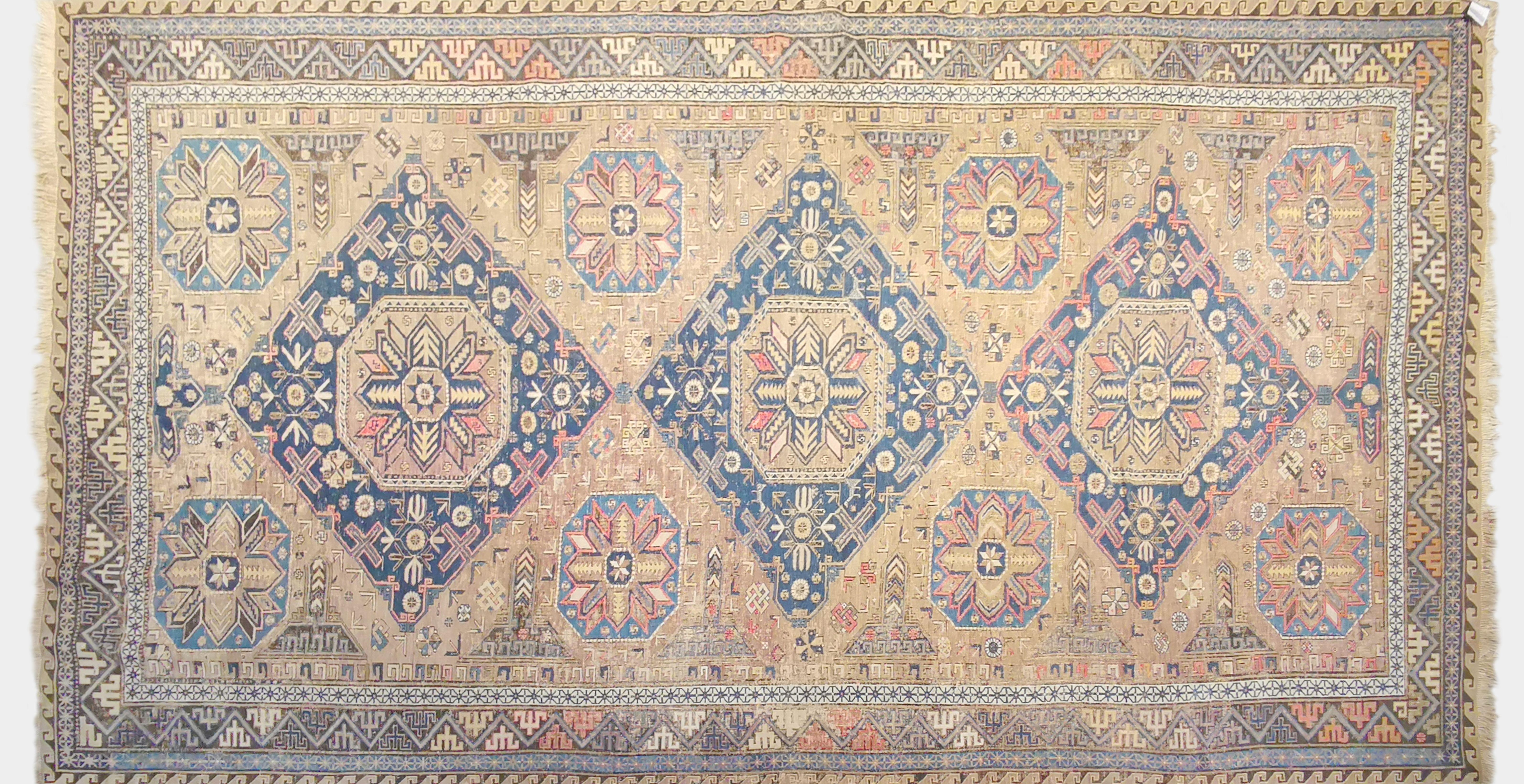 Laine à décor géométrique sur fond rouge, 323x165 cm. Provenance...