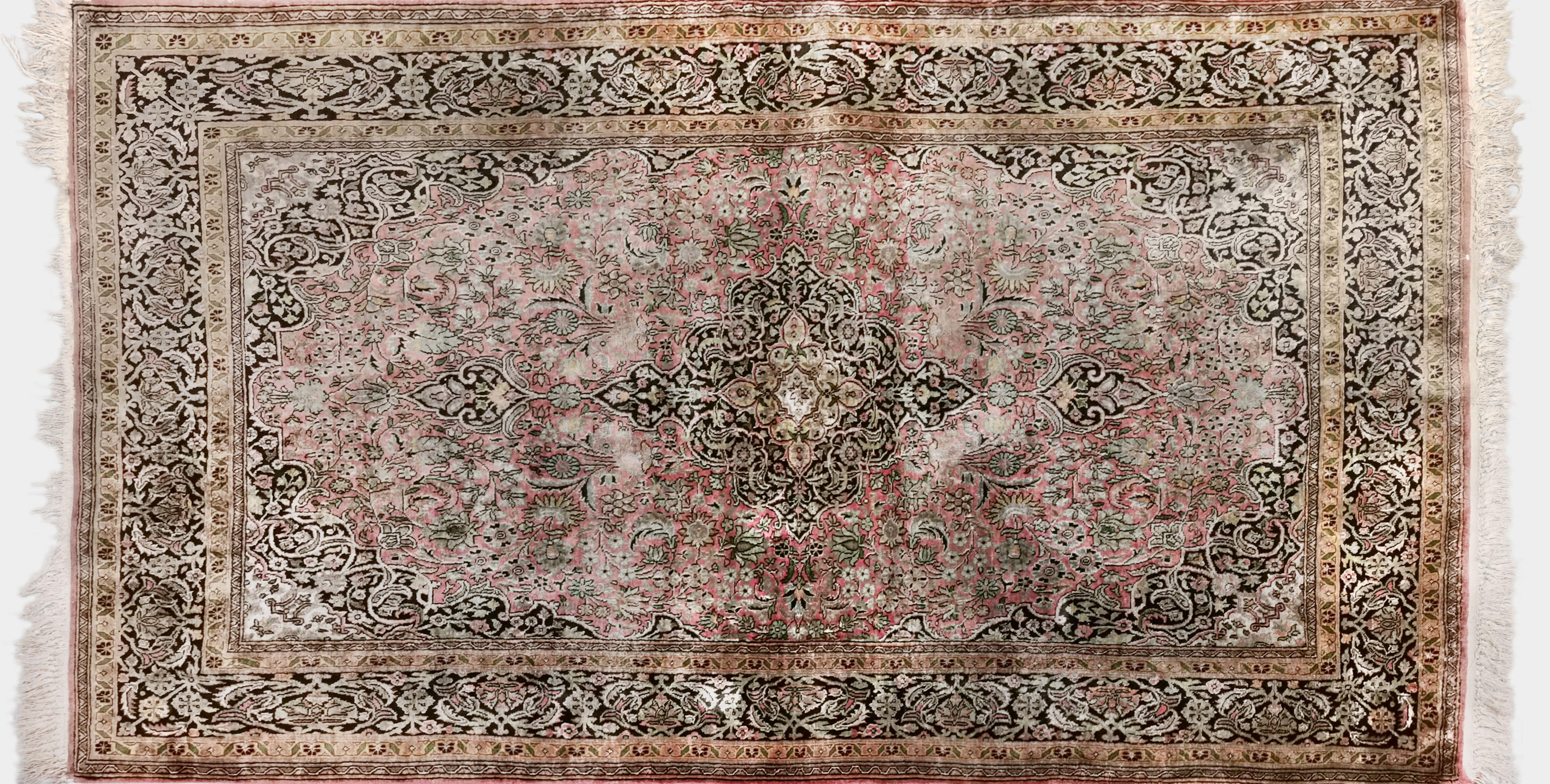Soie à motif central de rinceaux sur fond rose, bordure sur fond noir, 183x119 cm