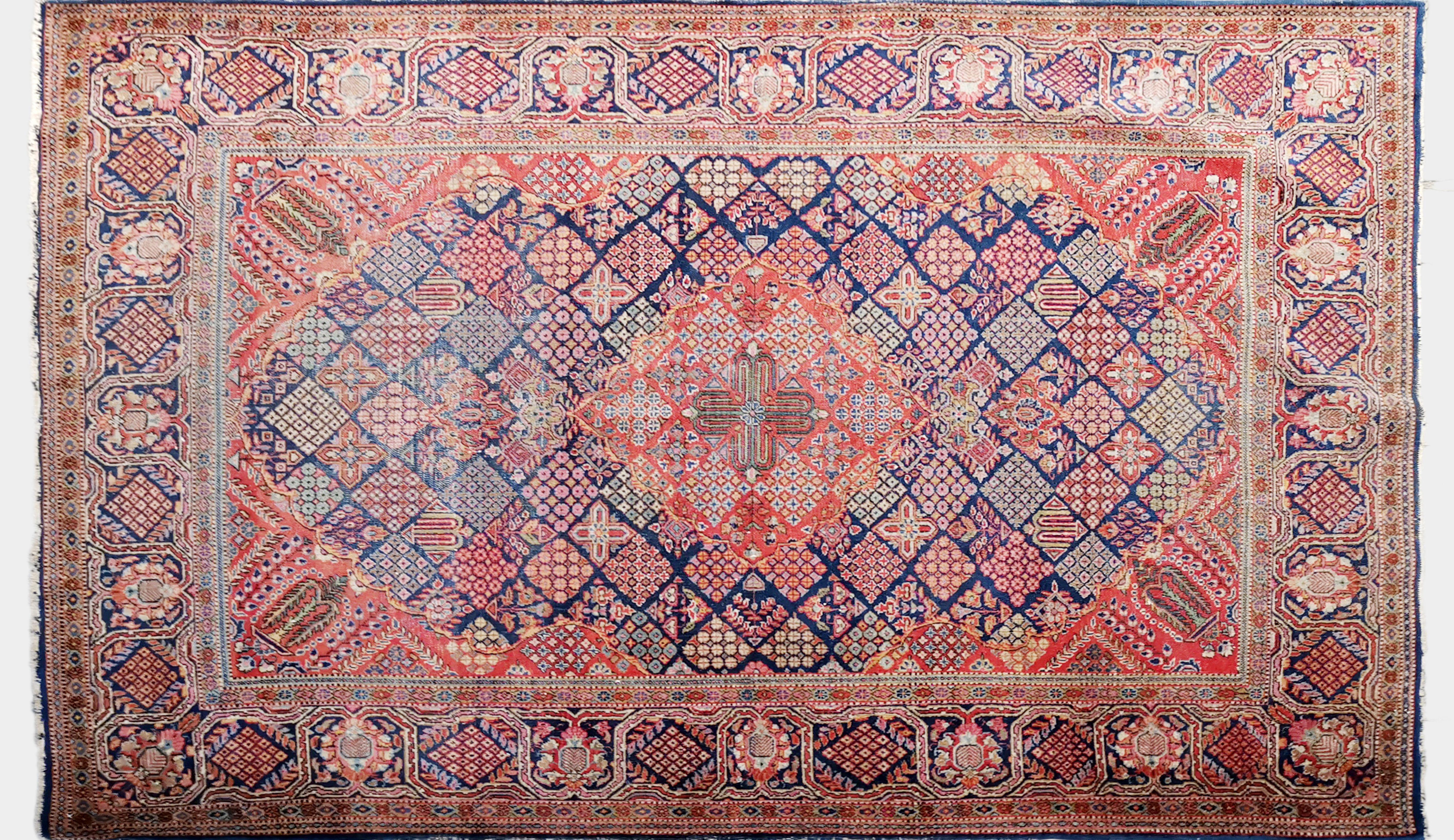 Laine à décor géométrique sur fond rouge, 323x165 cm. Provenance...