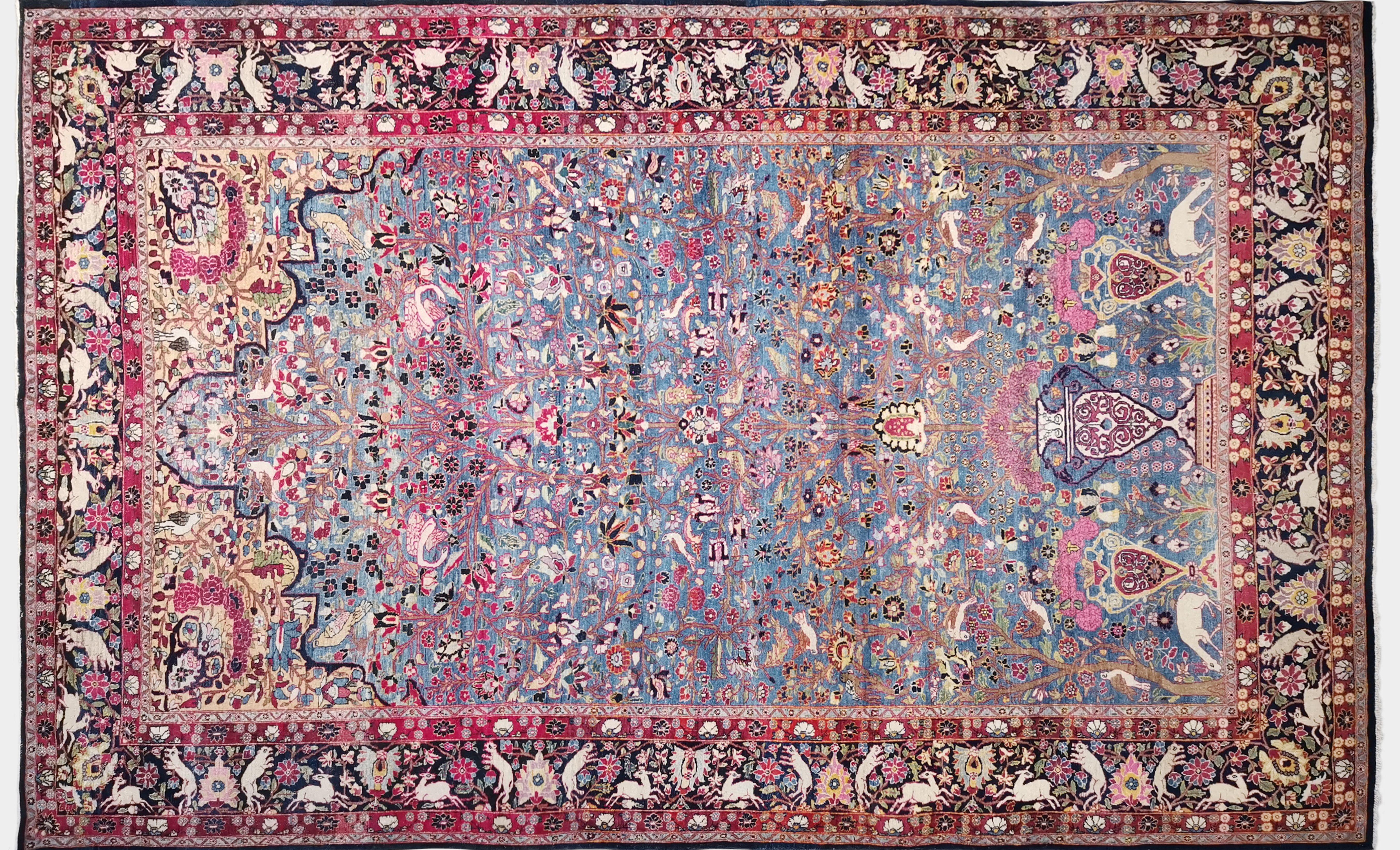 Laine à motif d'un arbre et d'oiseaux et cervidés sur fond lavande, bordure à motif d'animaux sur fond bleu nuit, 315x190 cm