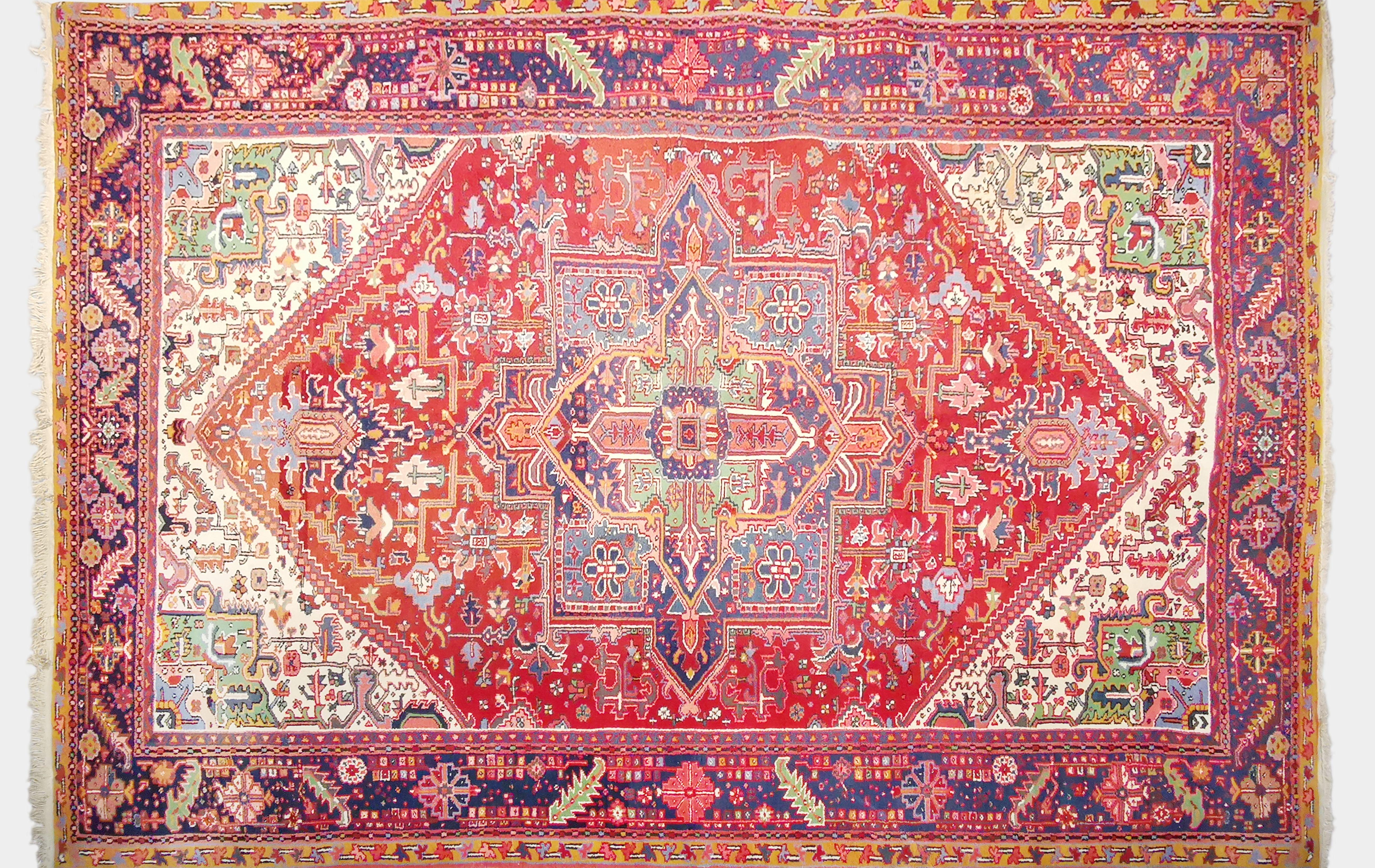 Laine à décor géométrique sur fond rouge, 323x165 cm. Provenance...
