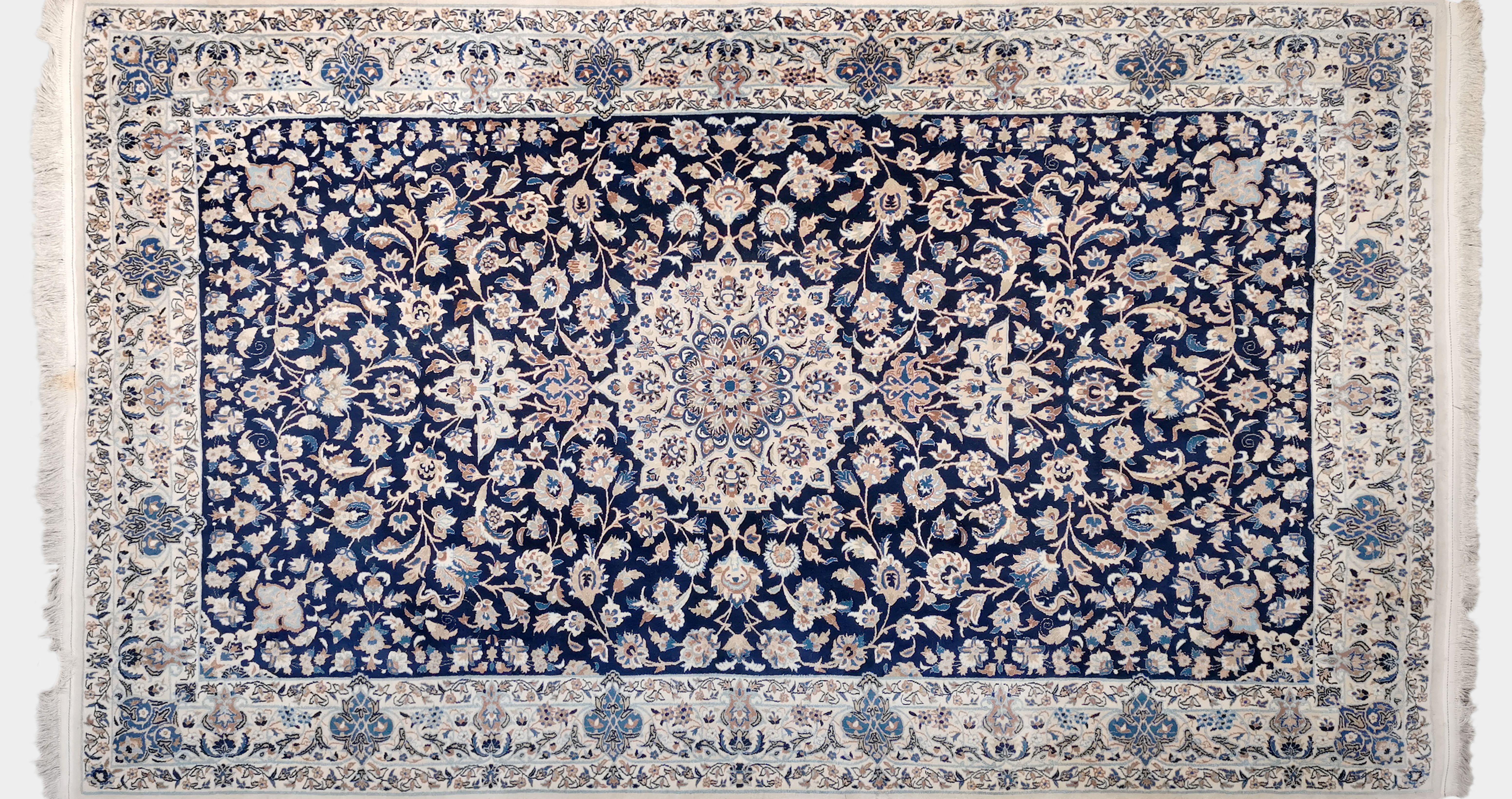 Laine, à décor de médaillons beiges sur fond bleu et bordures beiges, 290x160 cm