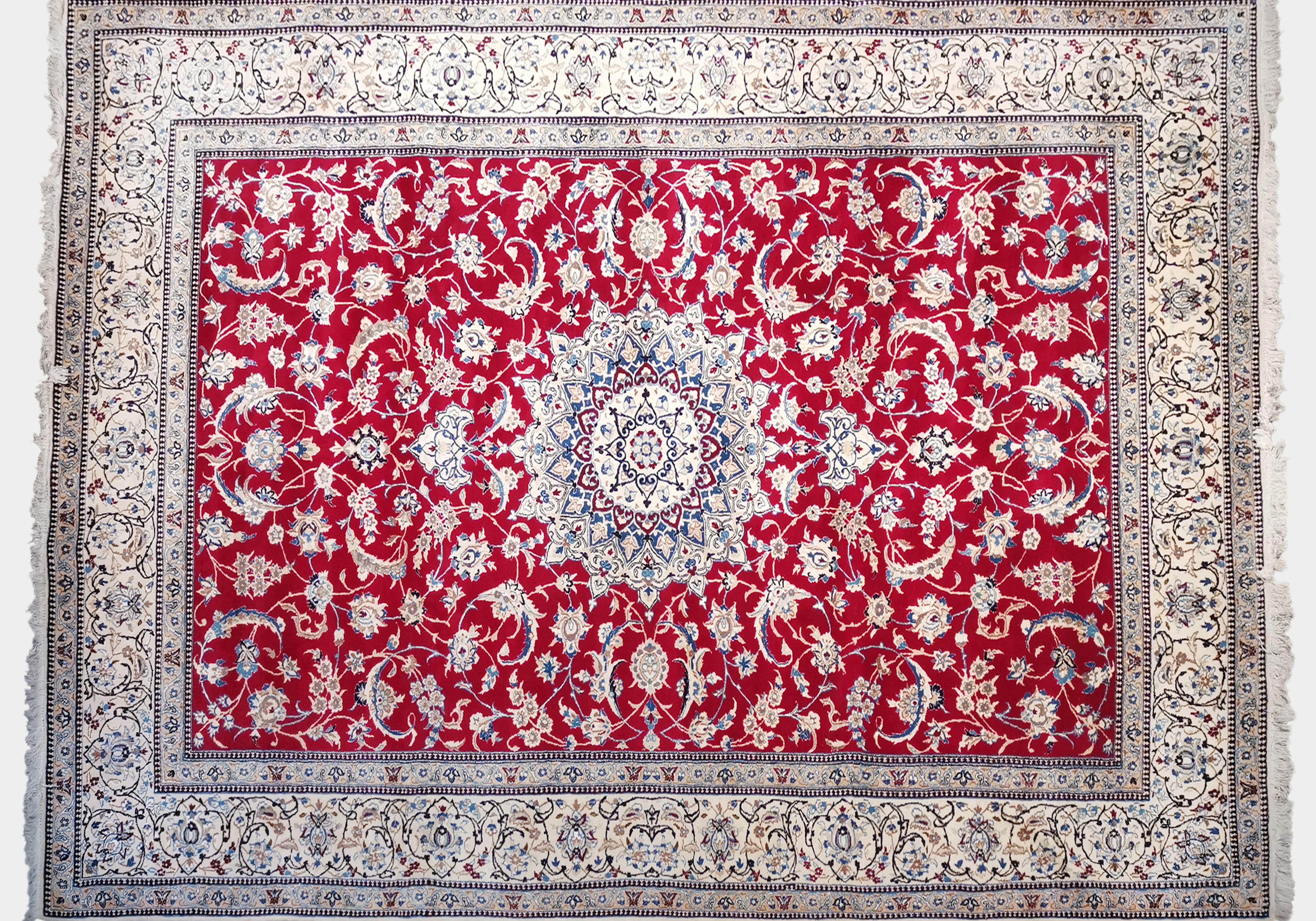 Laine à décor géométrique sur fond rouge, 323x165 cm. Provenance...