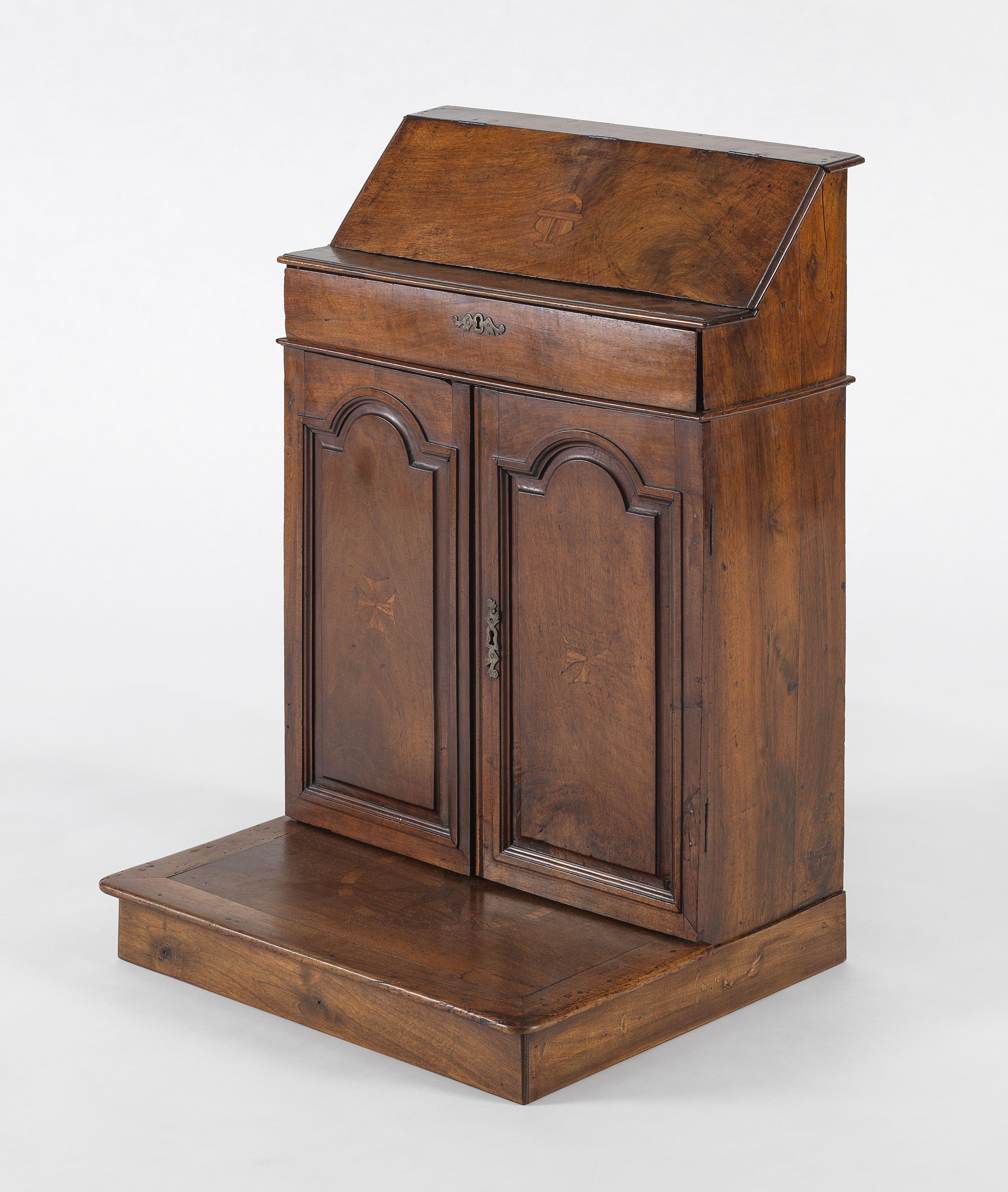 Noyer à décor marqueté de croix de Malte et calice, deux vantaux, un tiroir et un abattant, 83x49x55 cm