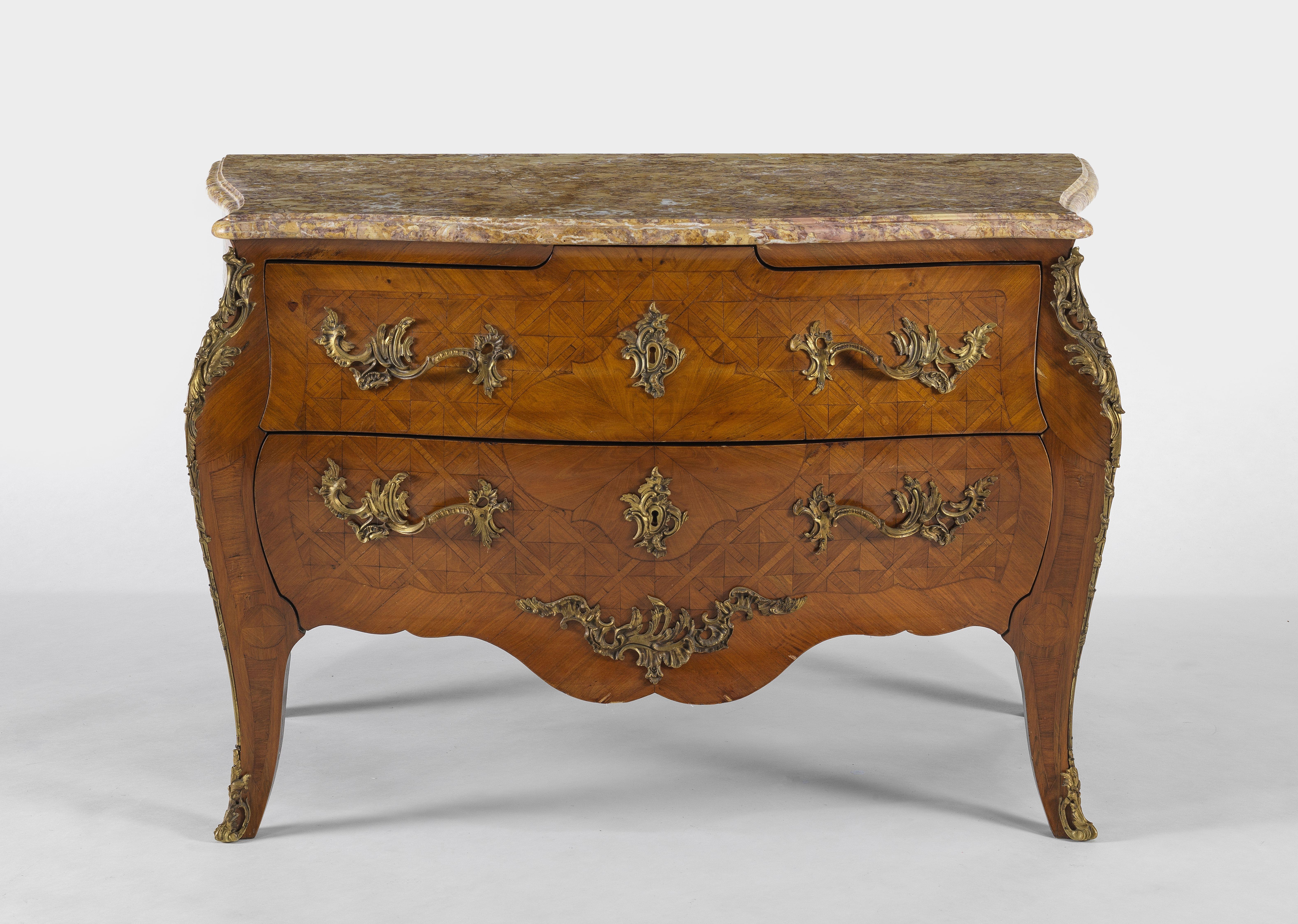 Marqueterie de bois de rose, deux tiroirs, bronze et marbre beige, 83x127x60 cm