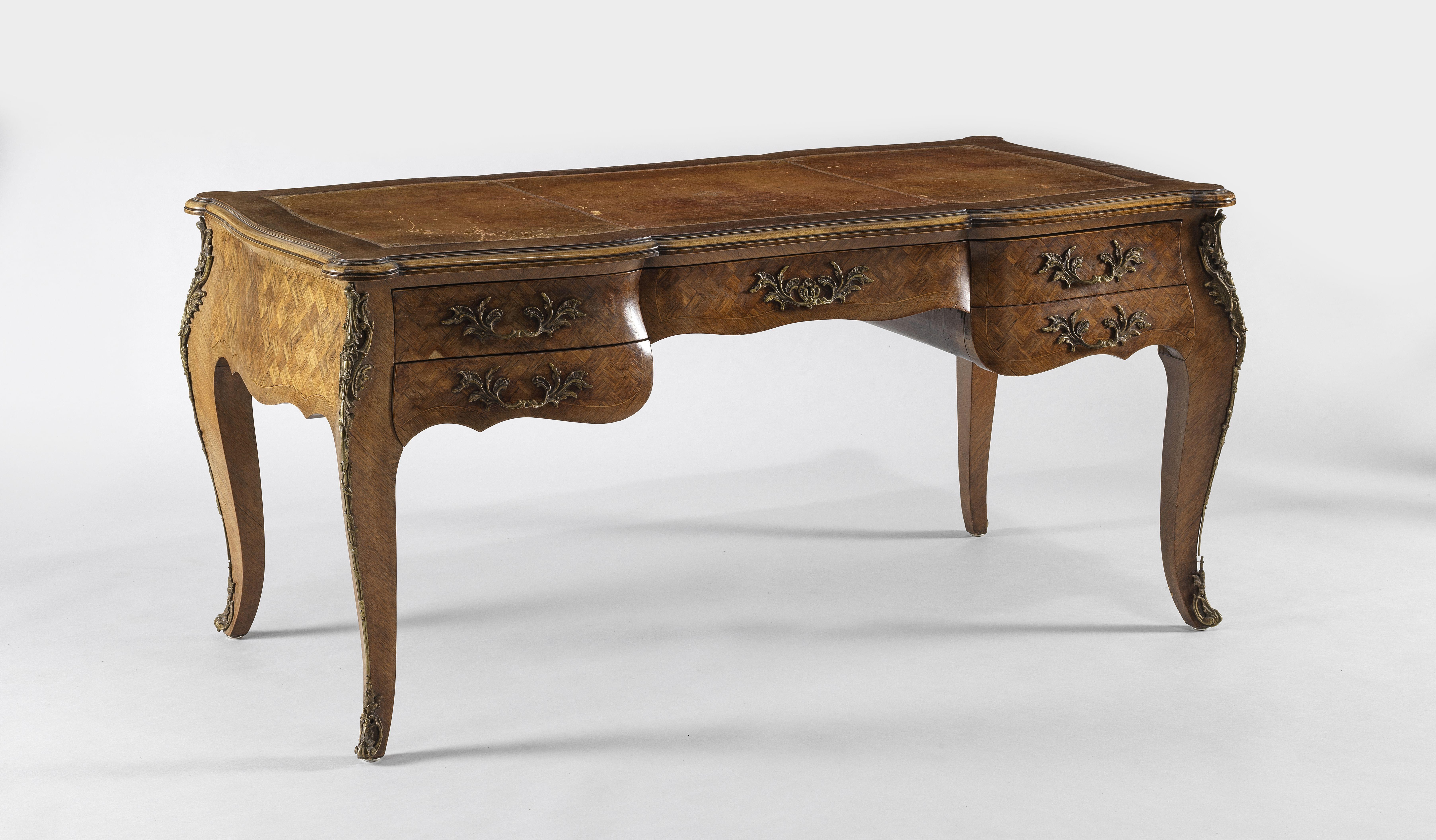 Cinq tiroirs, bois de placage bronze et cuir doré au petit fer, 78x165x84 cm