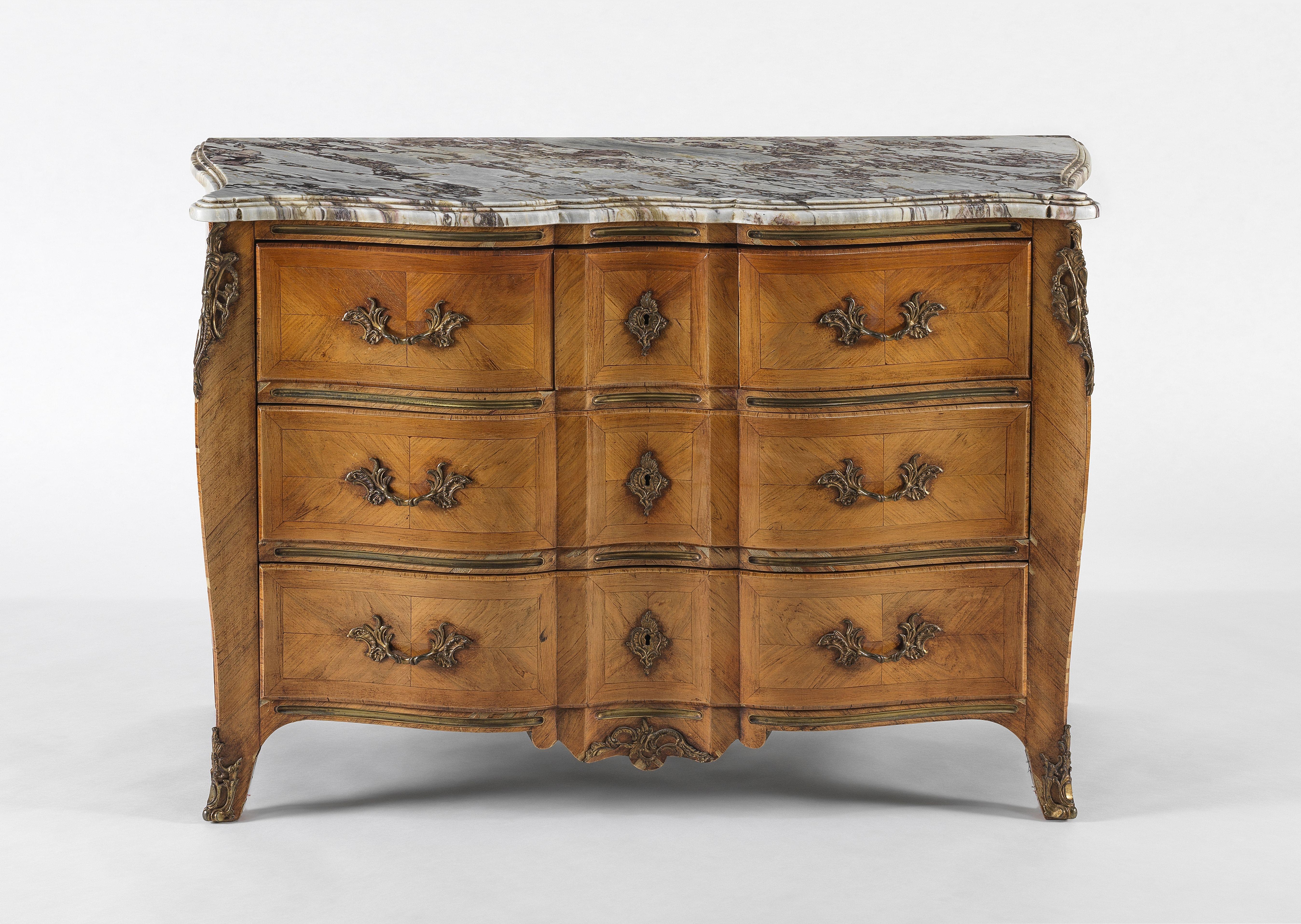 Cinq tiroirs, marbre blanc veiné, bronze, 84x126x62 cm
