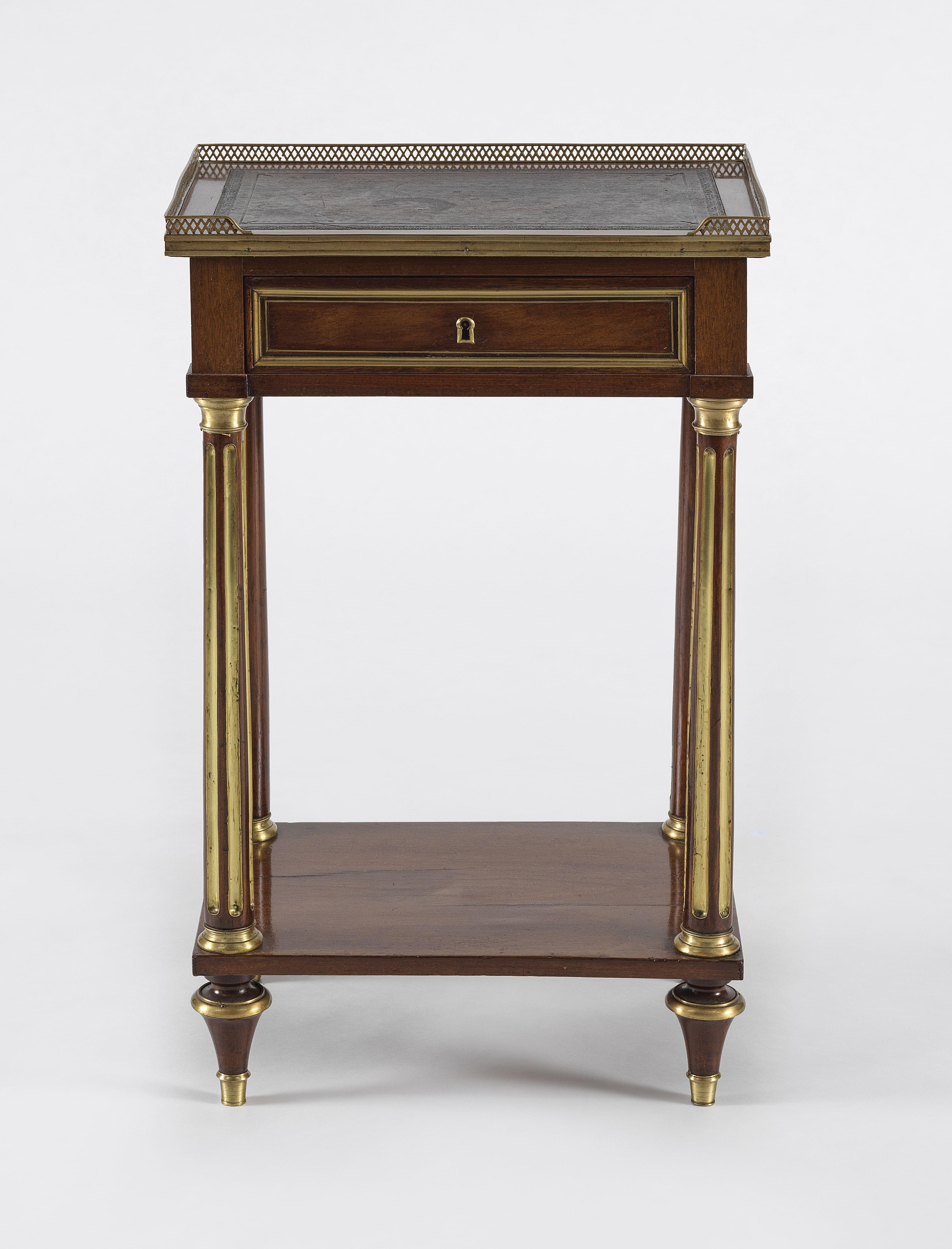 Un tiroir, acajou et laiton, dessus de cuir à galerie, 78x49x36 cm