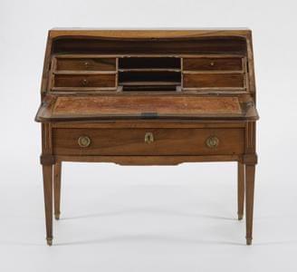 Trois tiroirs, un abattant, noyer et filets de bois clair et foncé, 100x98x48 cm