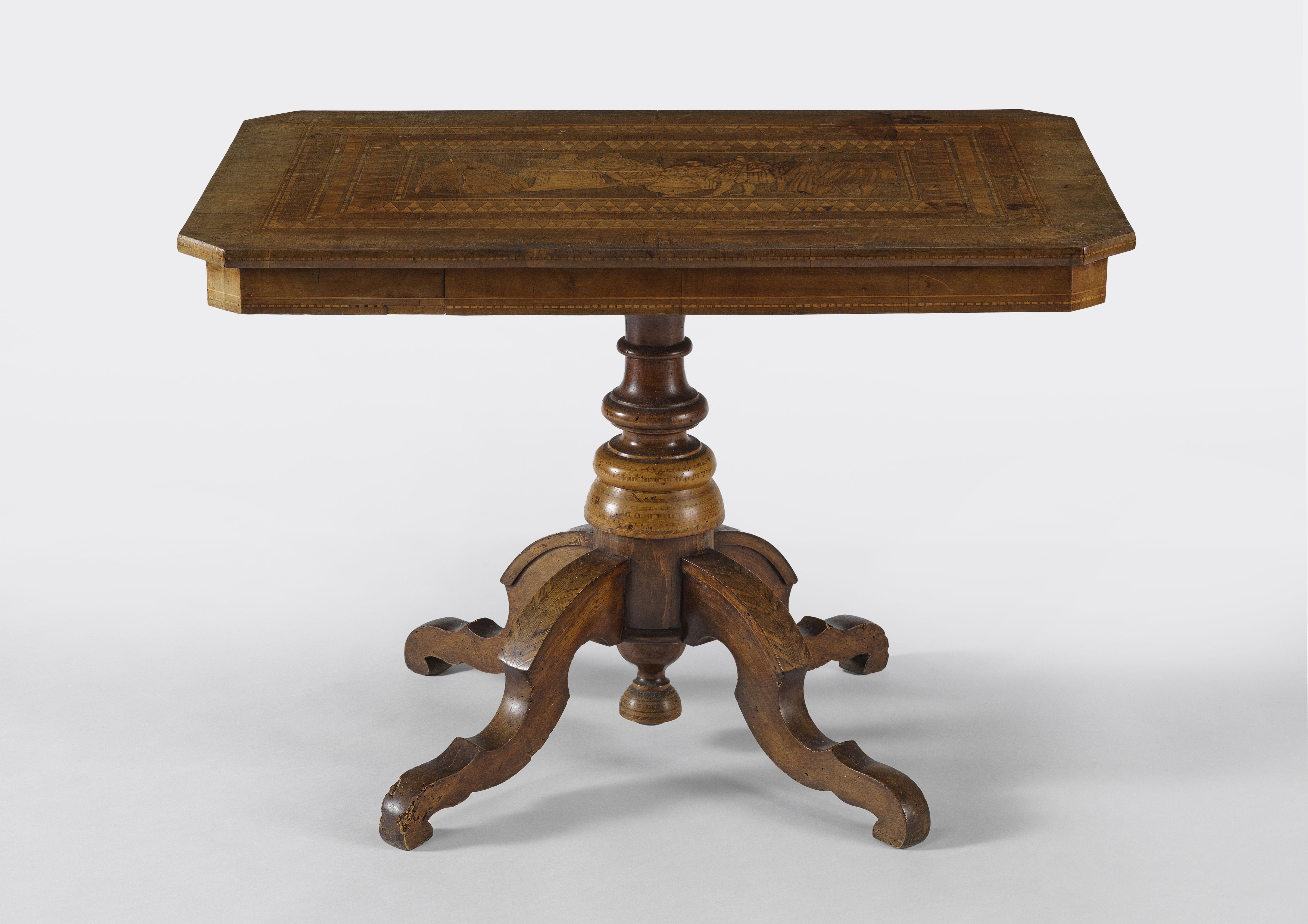 Plateau marqueté à motif de Christophe Colomb et les rois catholiques, 68x100x66,5 cm
