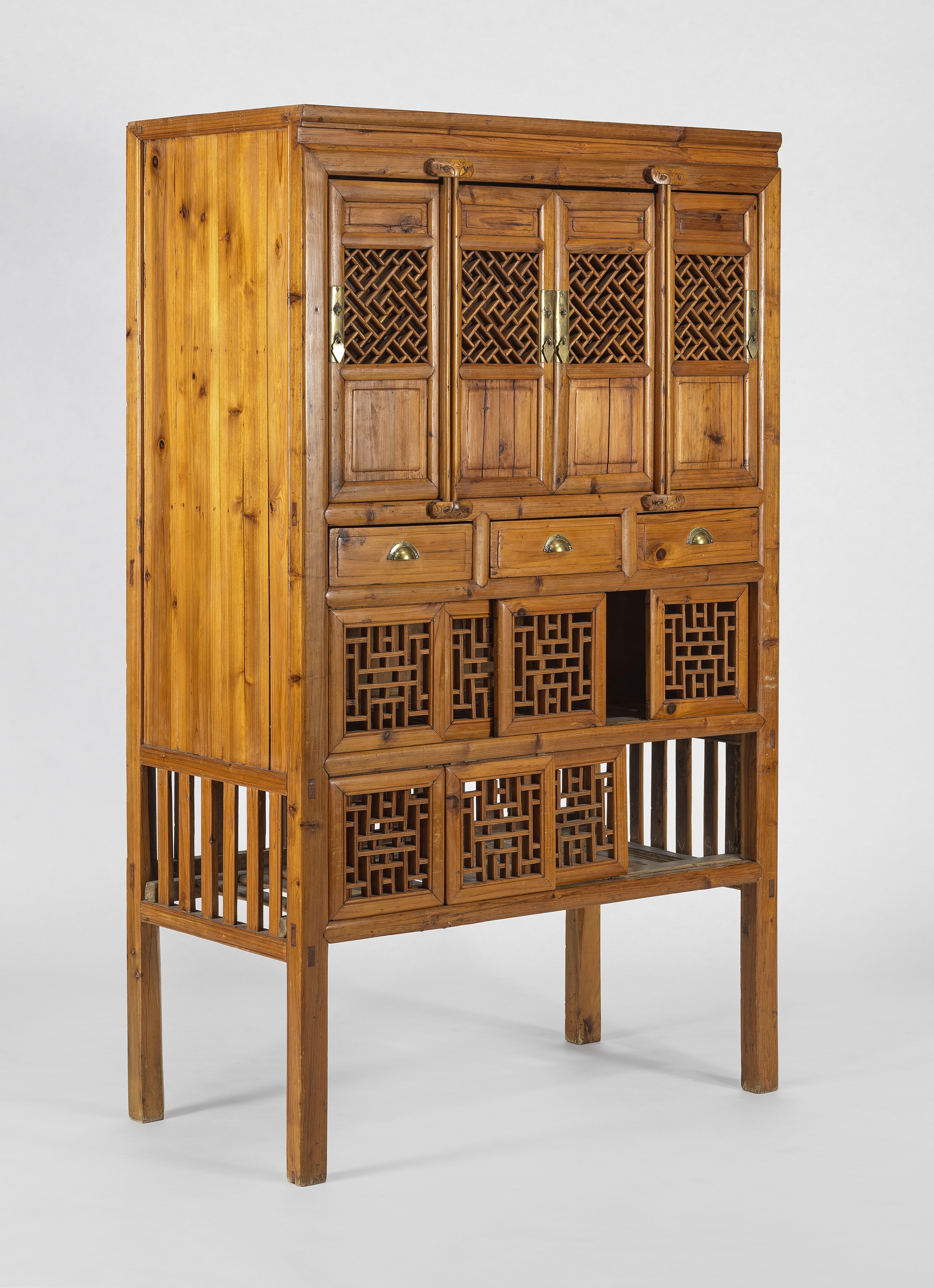 Douze vantaux et trois tiroirs, bois au naturel, 108x108x54 cm