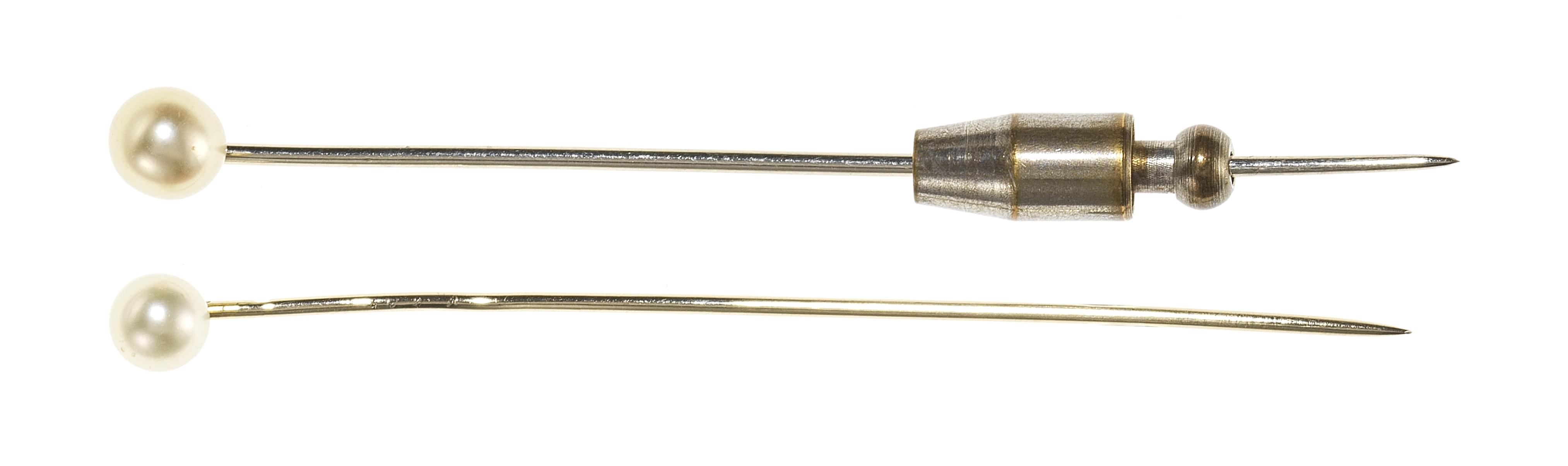 Travail français, or gris 750, H 6,5 cm. On joint une épingle à cravate sertie d'une perle, métal, H 6,5 cm.