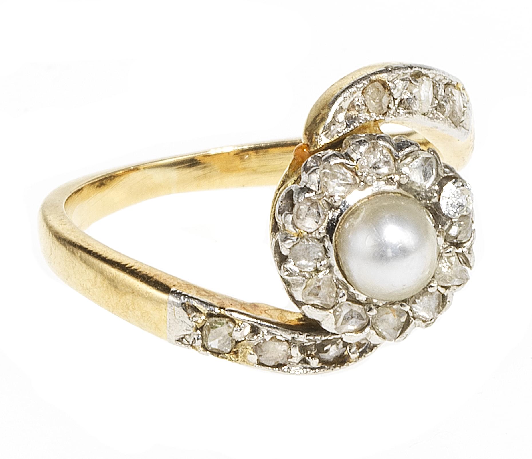 305. Bague centrée d'une perle (D env. 9 mm) entourée de diamants (en...
