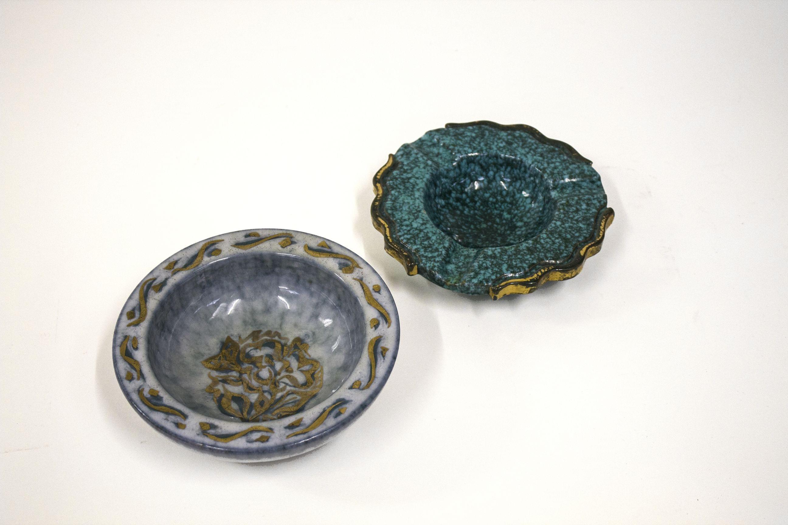 Deux cendriers, céramique émaillée turquoise et or, D 16 et 17 cm