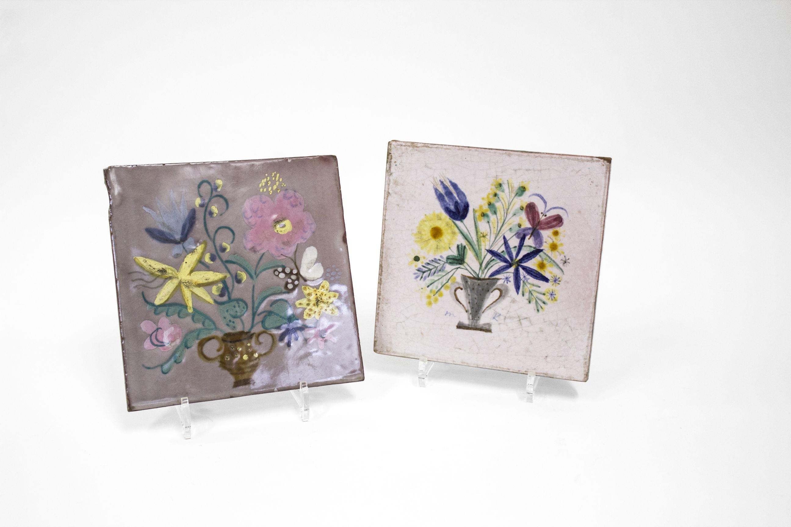Deux carreaux carrés, céramique émaillée à décor de bouquets de fleurs, 20x20 cm