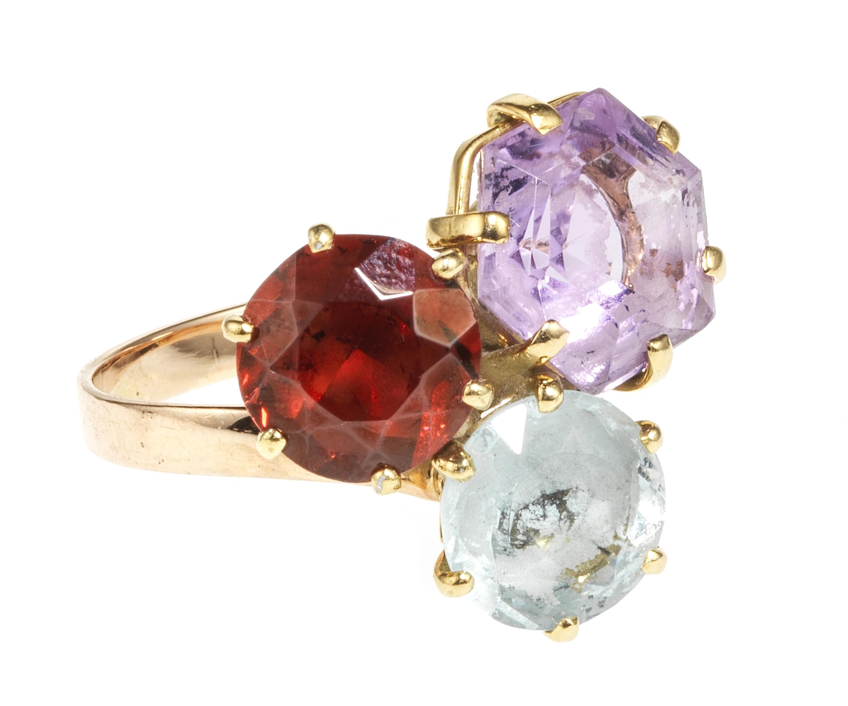 3910. Bague sertie d'une améthyste, d'un grenat et d'une topaze bleue taille fantaisie et brillant