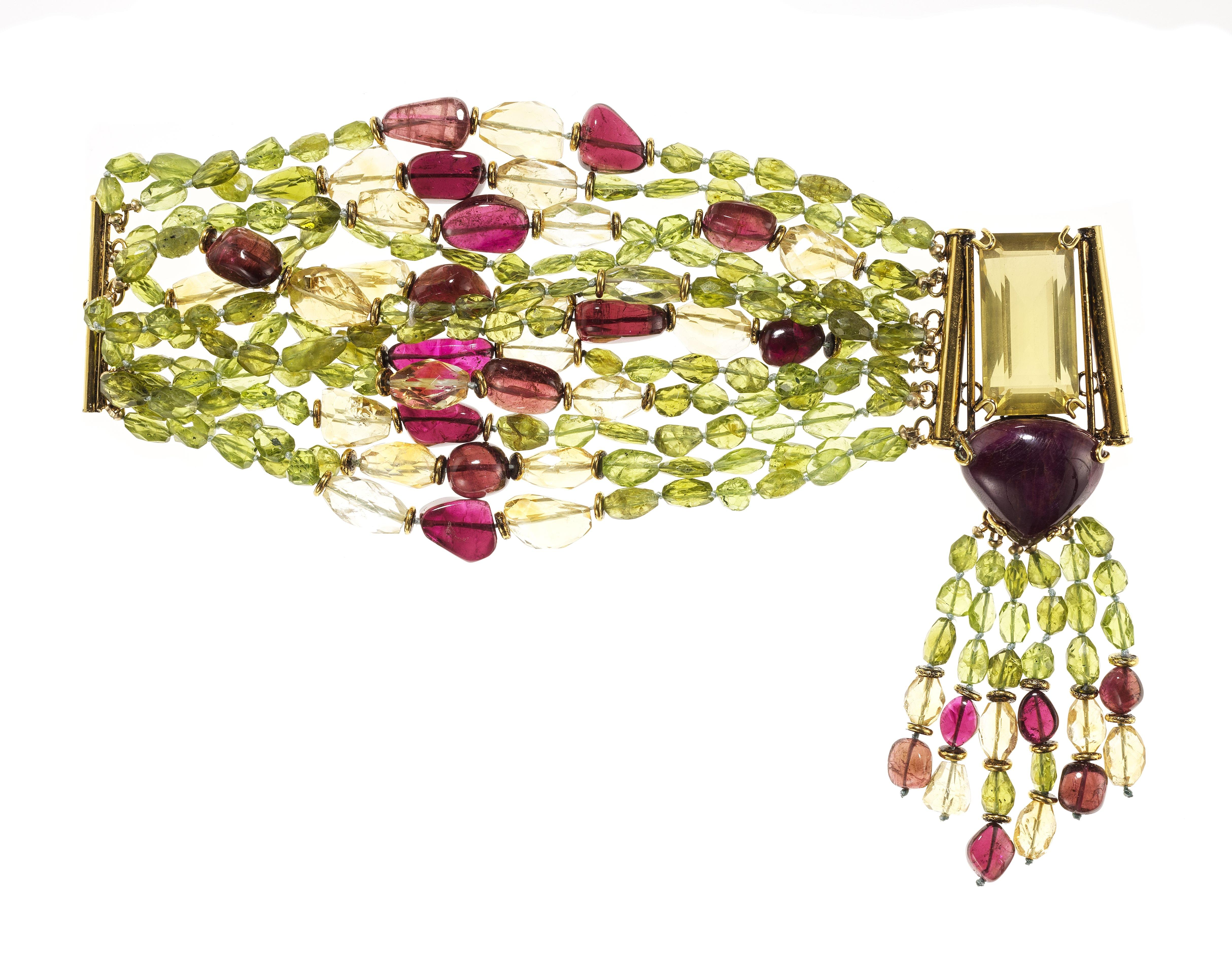 Composé de perles de péridots, citrines et probablement tourmalines roses, terminé par un fermoir serti d'une citrine rehaussée d'un rubis et d'un pompon au même motif que le bracelet, métal, L 21 cm