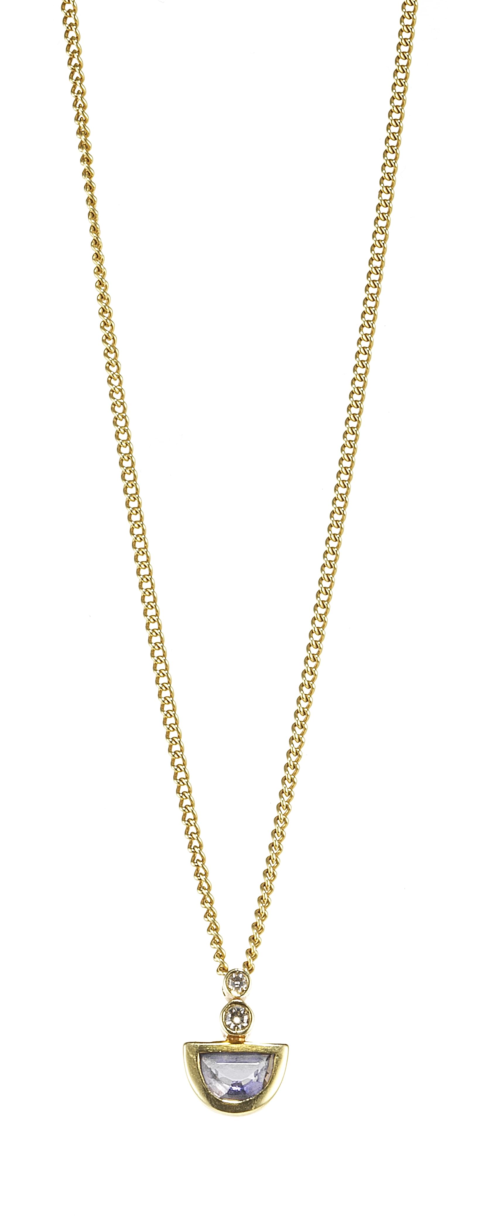 3940. Pendentif serti d'une tanzanite taille fantaisie rehaussée de deux diamants, retenu par une chaîne à maille gourmette