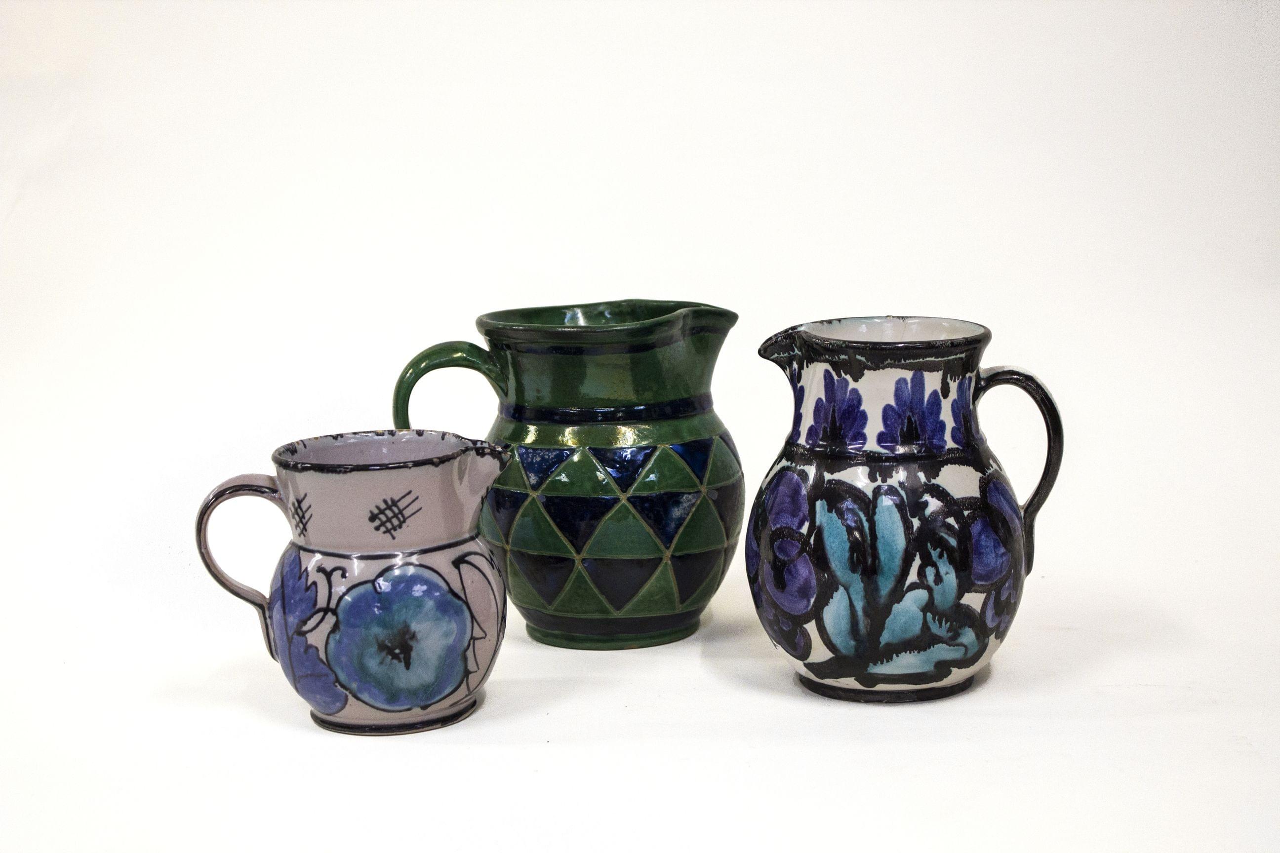 Trois pichets, céramique émaillée sur fond vert, les deux autres à décor de fleurs dans les tons de bleu, H de 12 à 16 cm