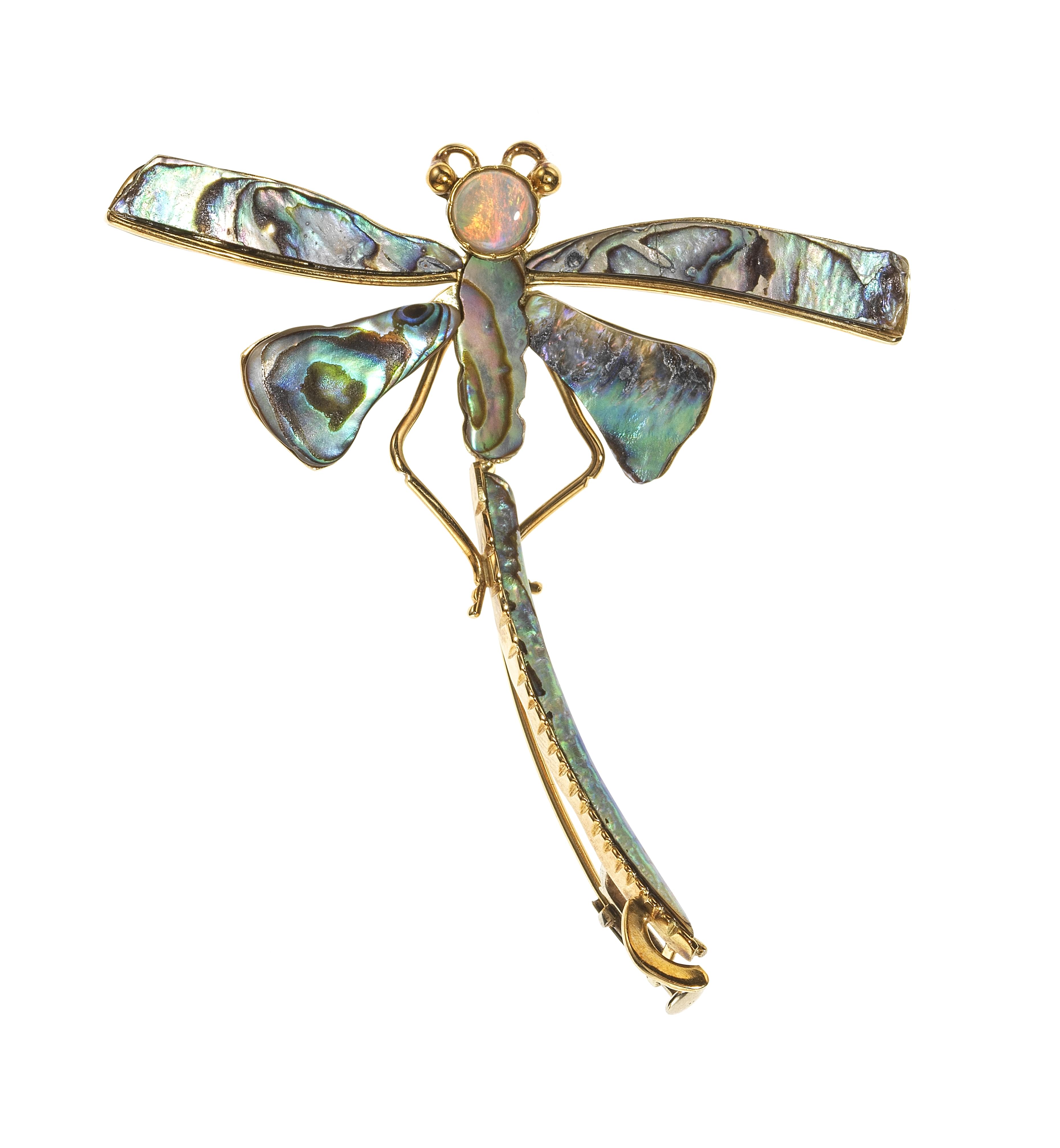 Au corps composé de plaques de nacre d'abalone et à la tête sertie d'une opale à fond blanc ronde taille cabochon, travail autrichien, or 585, L 7 cm, poids brut 9 g