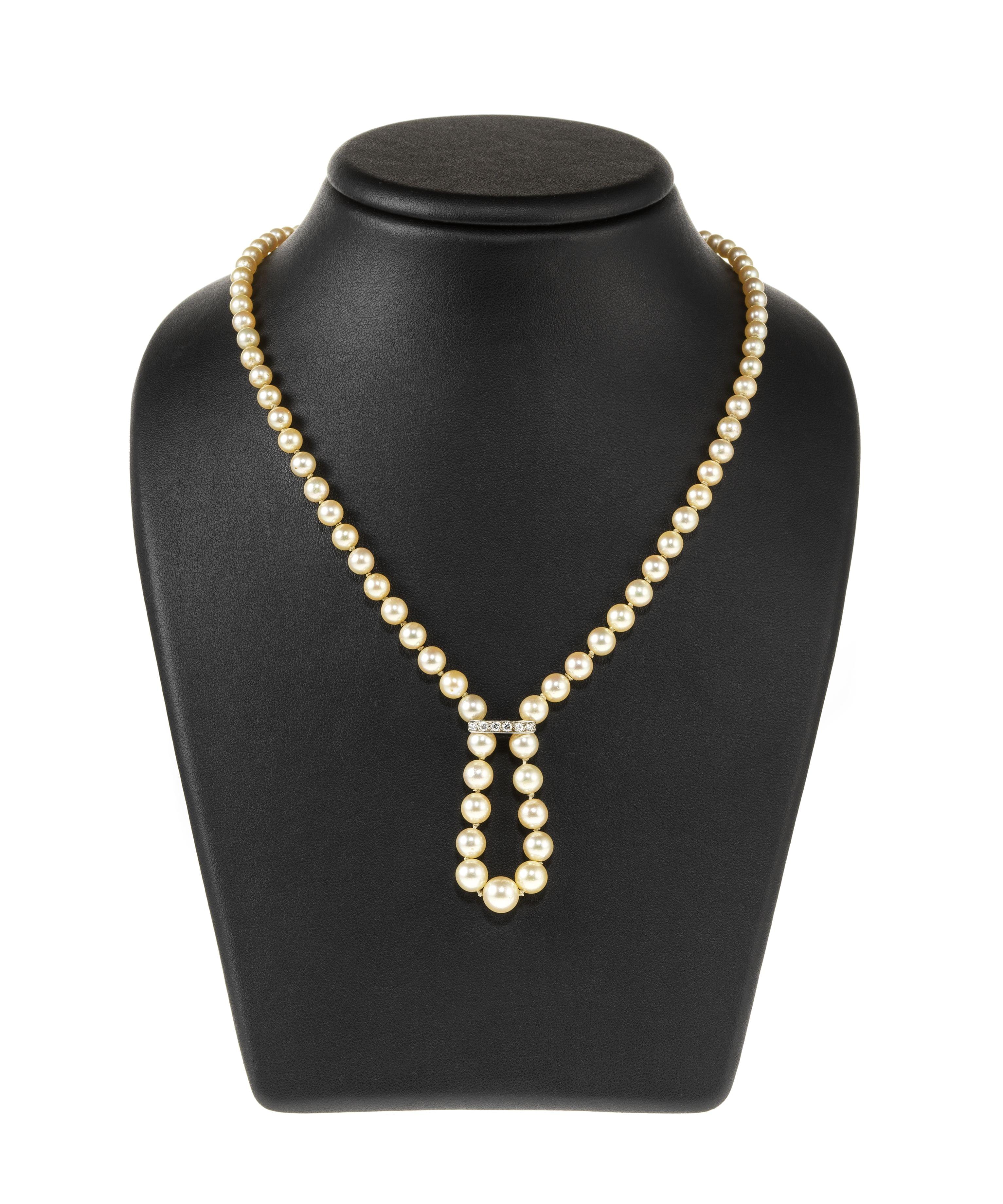 3975. Collier de perles en chute (D entre 4 et 7,5 mm) terminé par un fermoir serti de trois diamants (env. 0,35 ct)