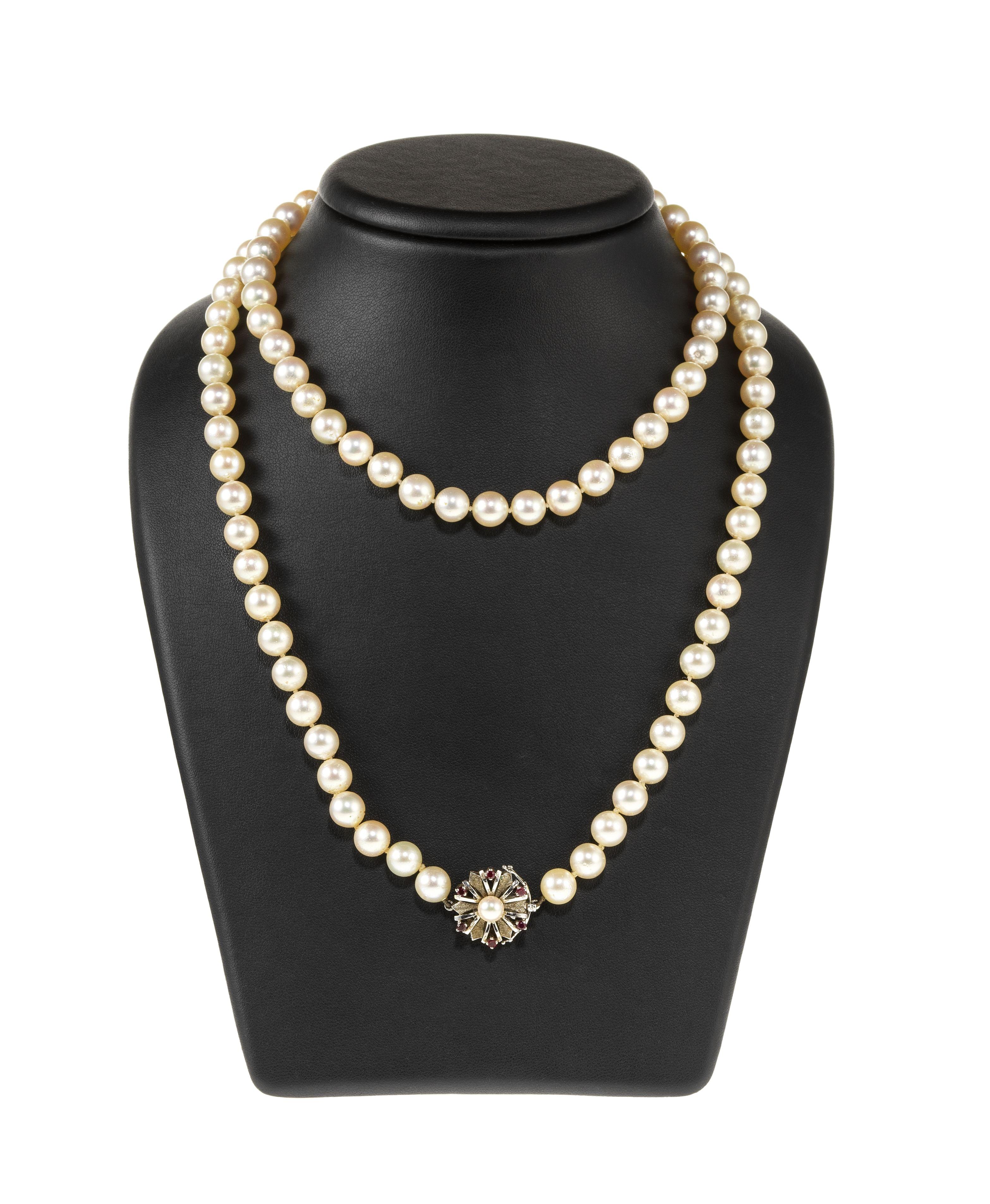 3976. Sautoir de perles (D env. 8 mm) terminé par un fermoir serti de rubis et centré d'une perle (6 mm)