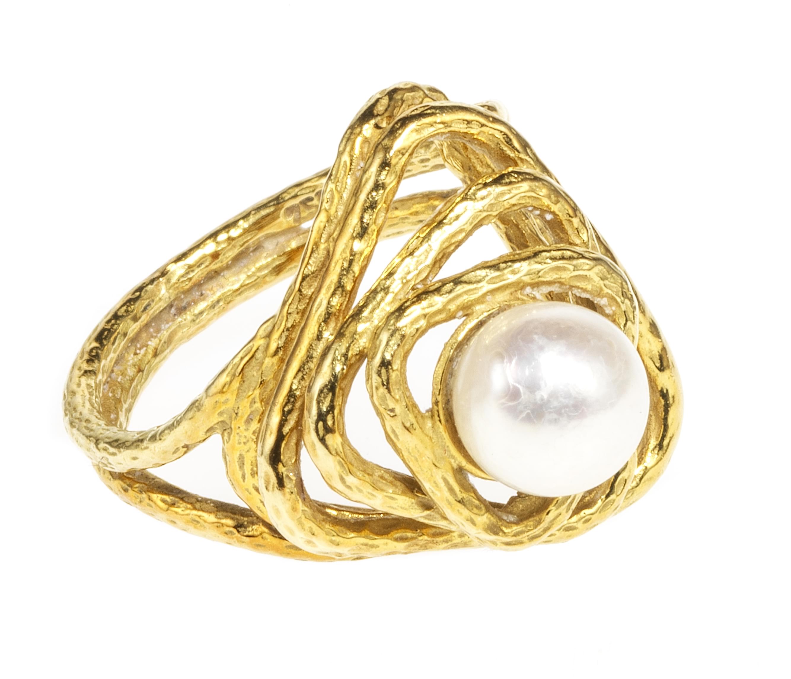 3980. Bague stylisée ajourée triangulaire centrée d'une perle (D env. 6,5 mm)