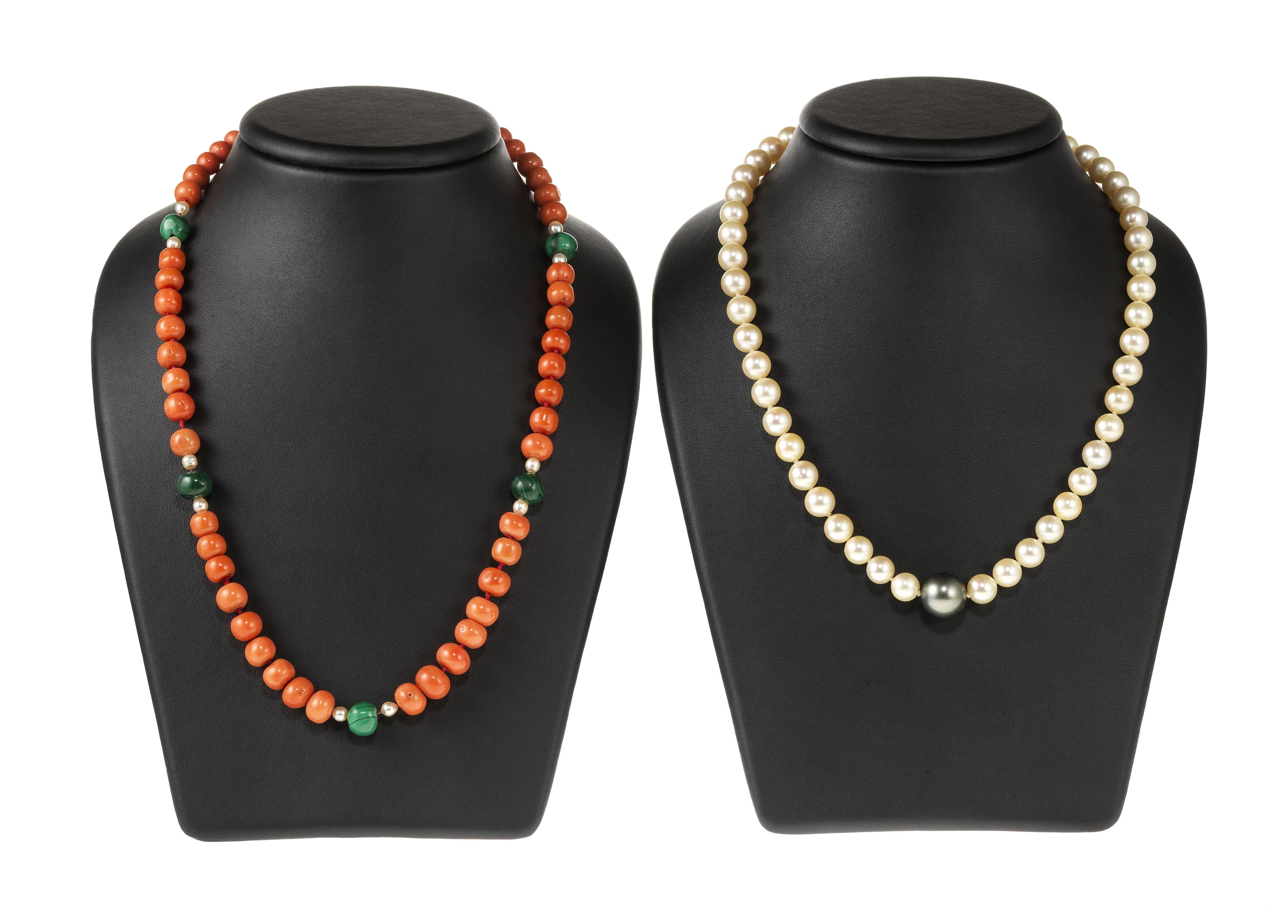 Fermoir en or 750 soudé, L 65 cm. On joint un collier de perles (D env. 8,5 mm) centré d'une perle de Tahiti (D env. 13 mm), fermoir en argent, L 48 cm.
