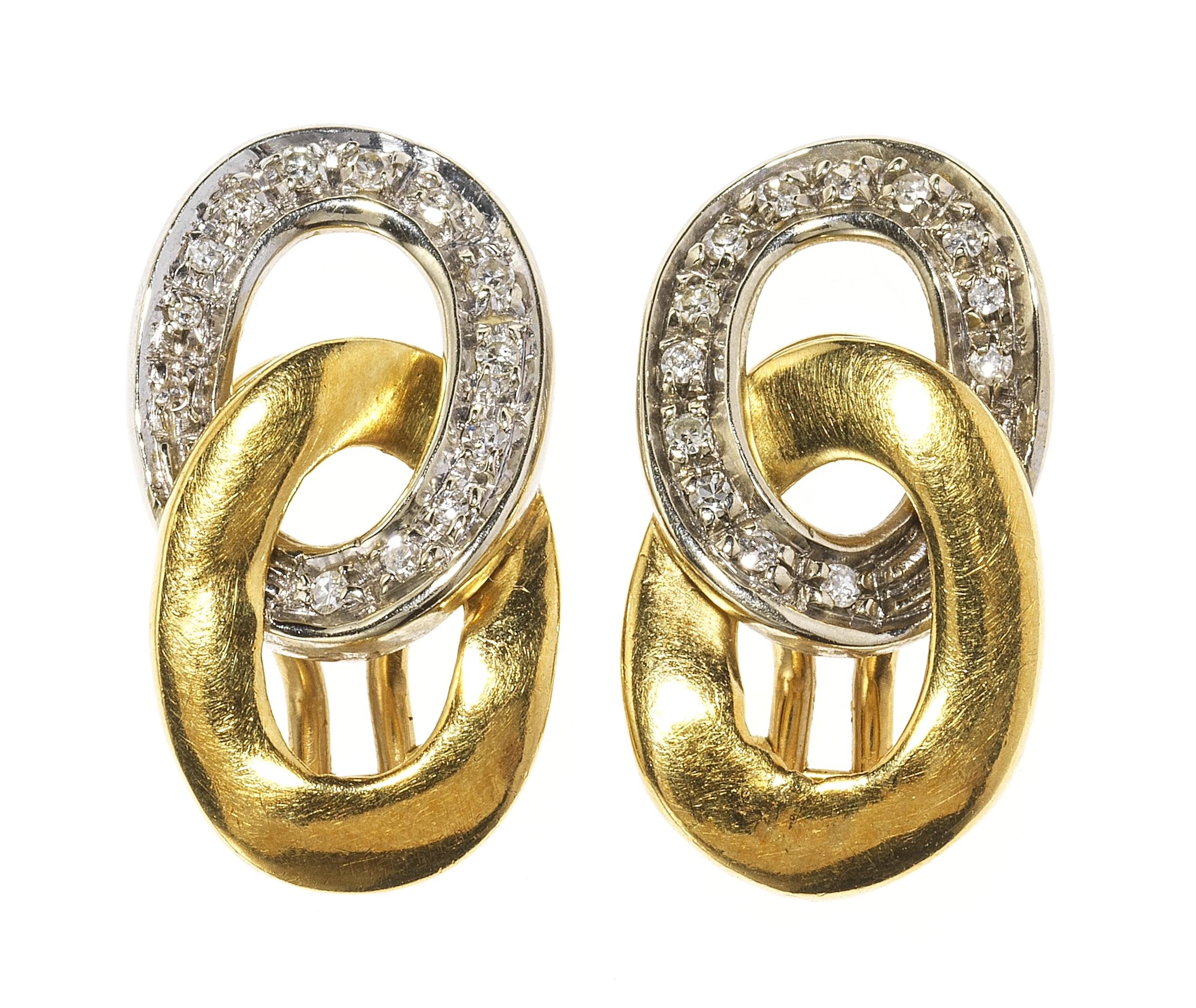 3995. Clips d'oreilles à maille gourmette deux ors sertis de diamants
