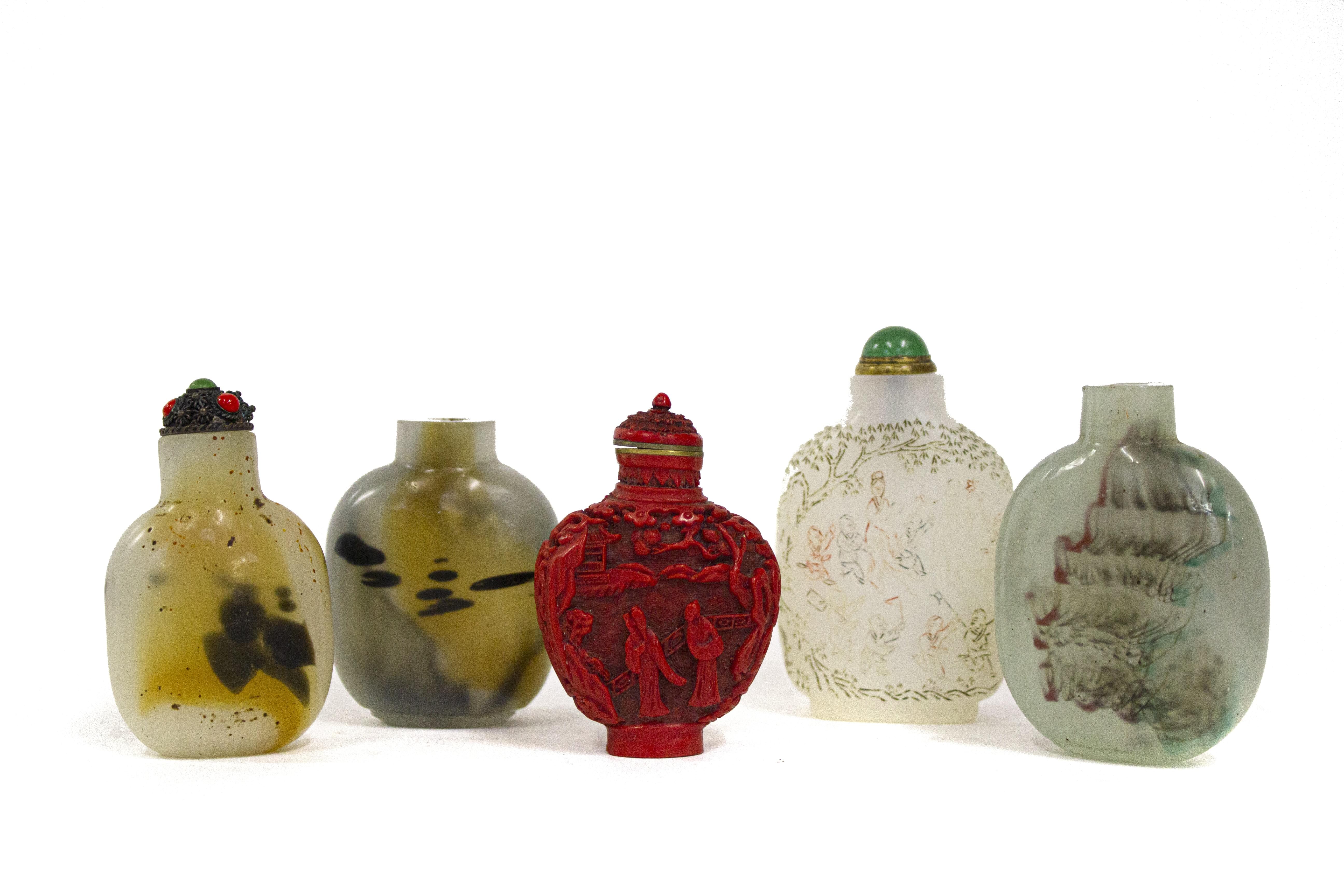 Verre et agate, H de 6 à 7 cm. On joint une tabatière en résine rouge.