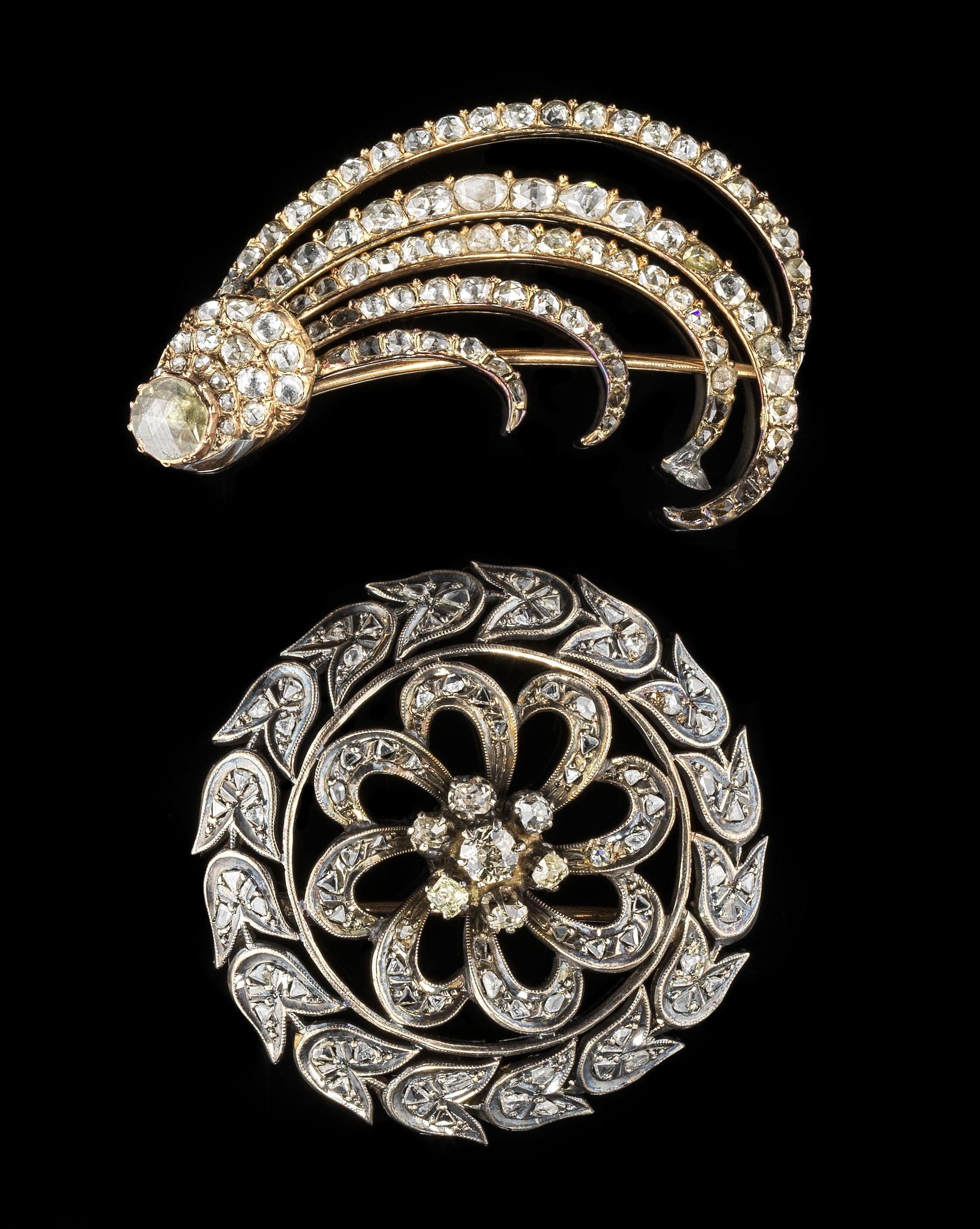 L'une ronde à motif ajouré centré de diamants taille ancienne et pavé de roses de diamants, l'autre à motif d'aigrette pavée de roses de diamants, or bas titre et argent, D env. 4 cm, L env. 5 cm. Provenance: collection privée genevoise