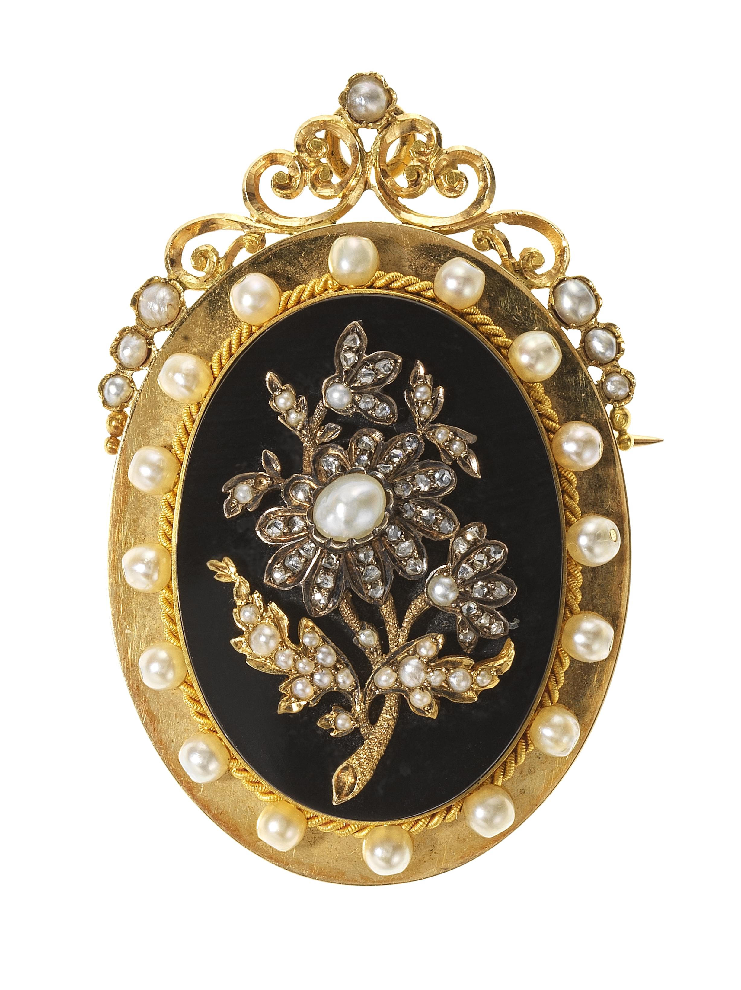 4006. Broche-pendentif porte-photo centrée d'une plaque d'onyx décorée d'un motif de fleur sertie de demi-perles et de roses de diamant