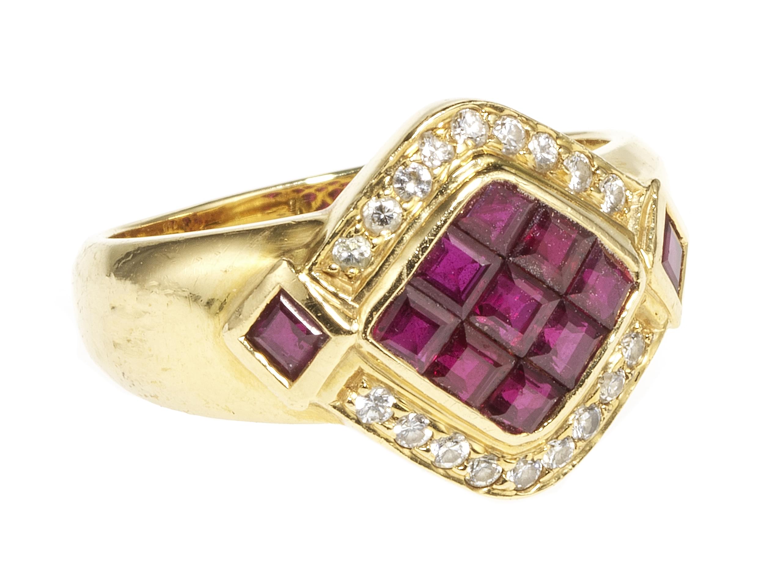4011. Bague centrée de rubis calibrés en serti invisible entourés de diamants