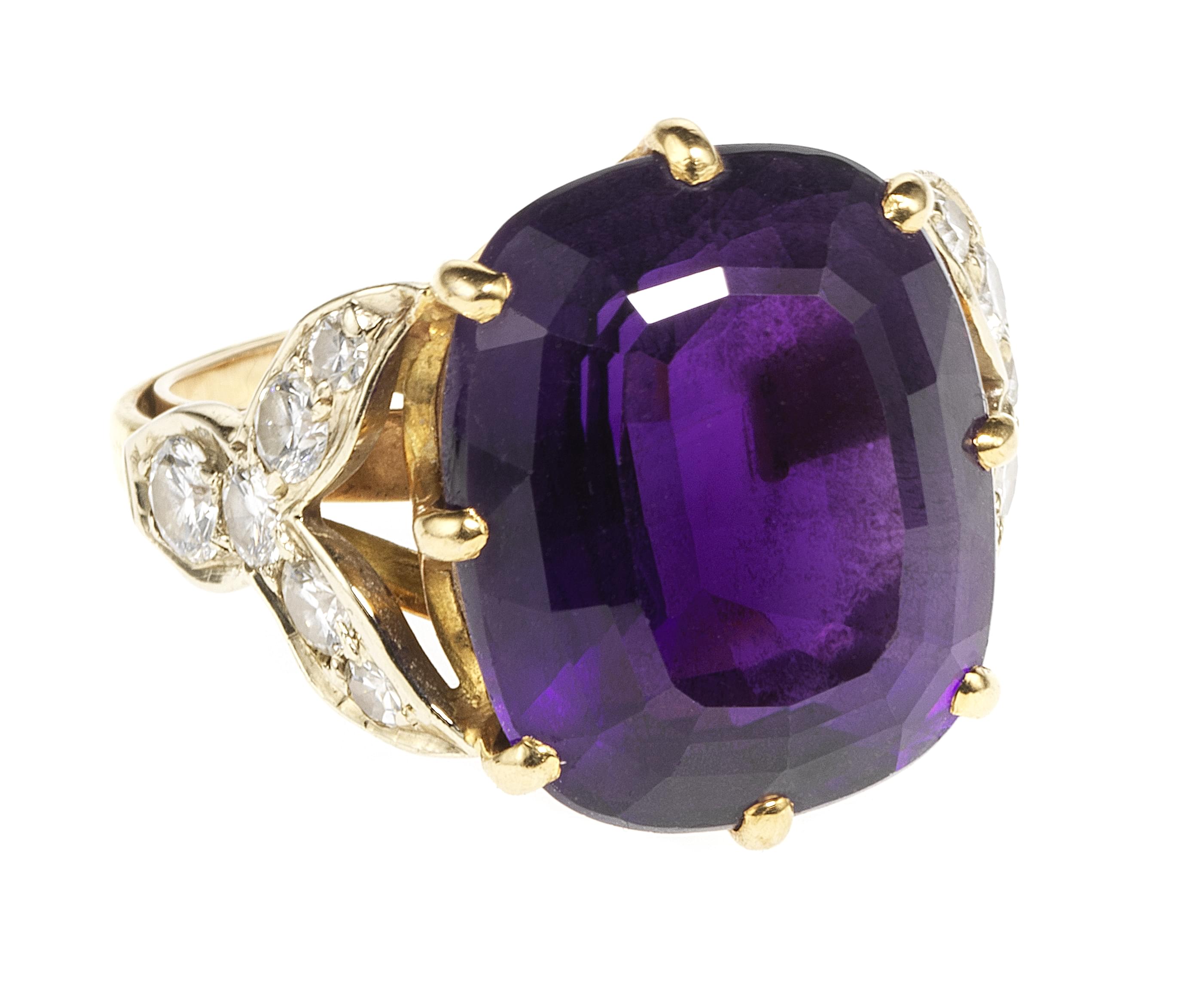 4028. Bague sertie d'une améthyste ovale (env. 9 ct) épaulée de diamants (env. 0,6 ct)