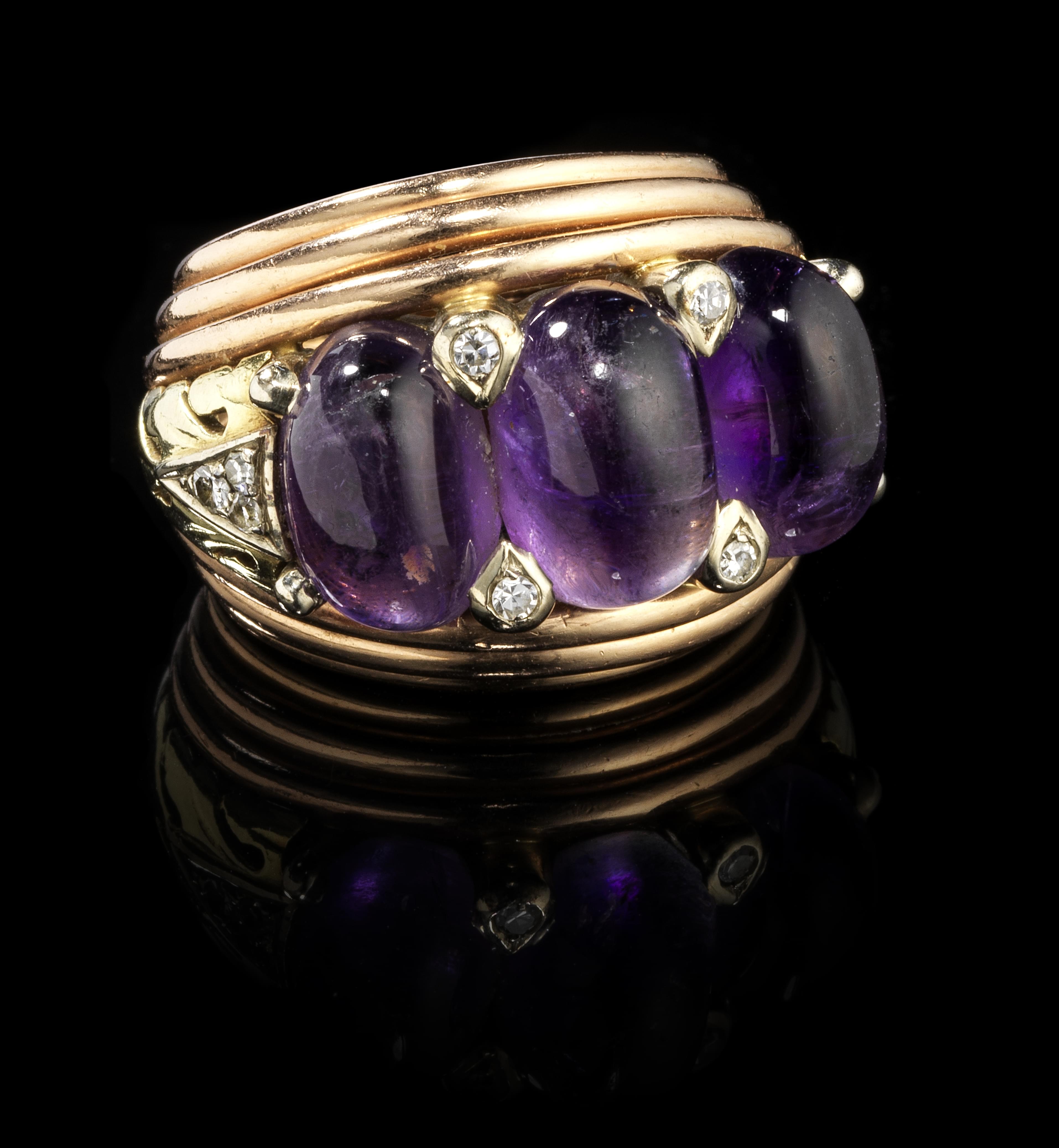 4065. Bague sertie de trois améthystes taille cabochon ovale rehaussées de diamants