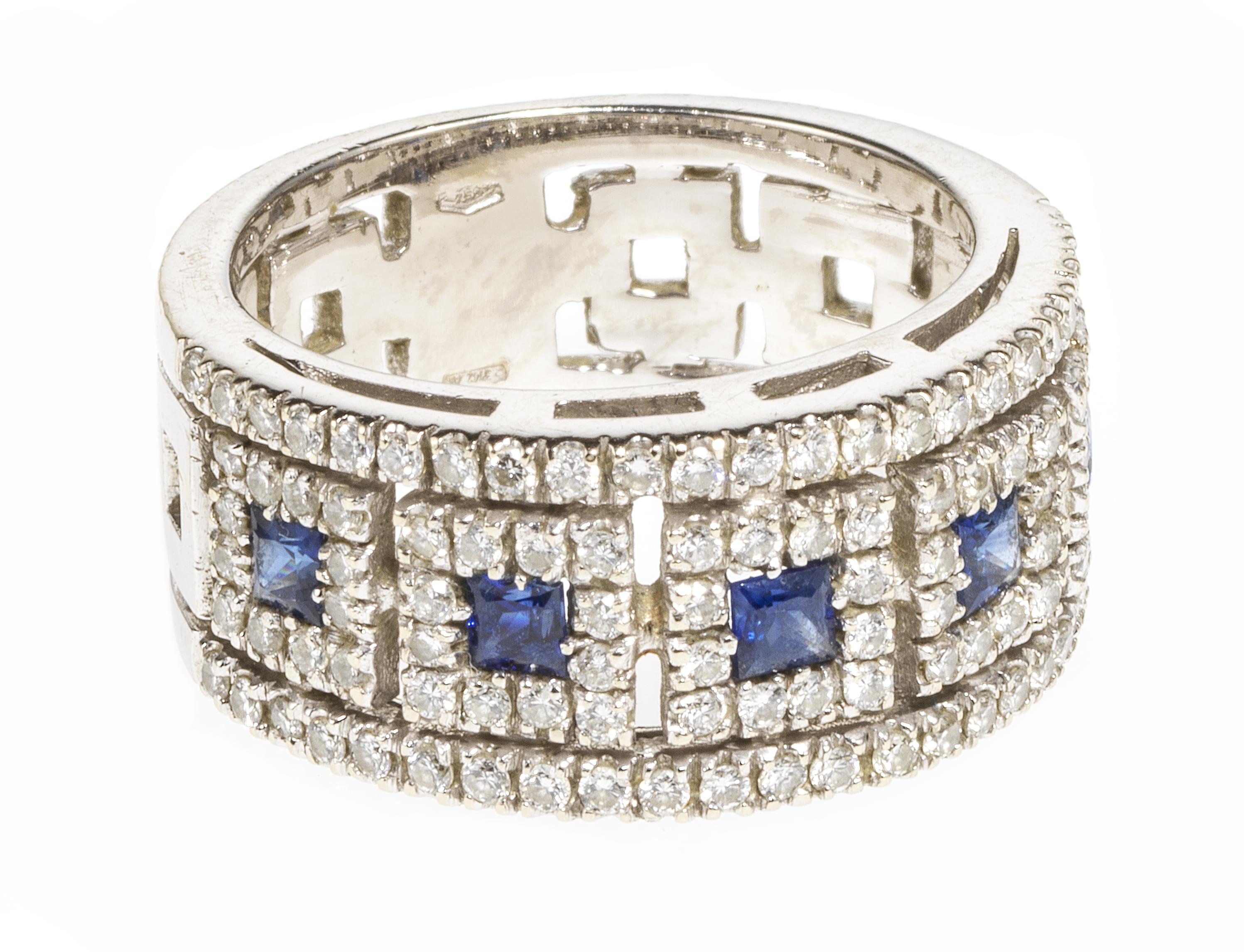 4069. Bague bandeau sertie de saphirs taille princesse entourés de diamants