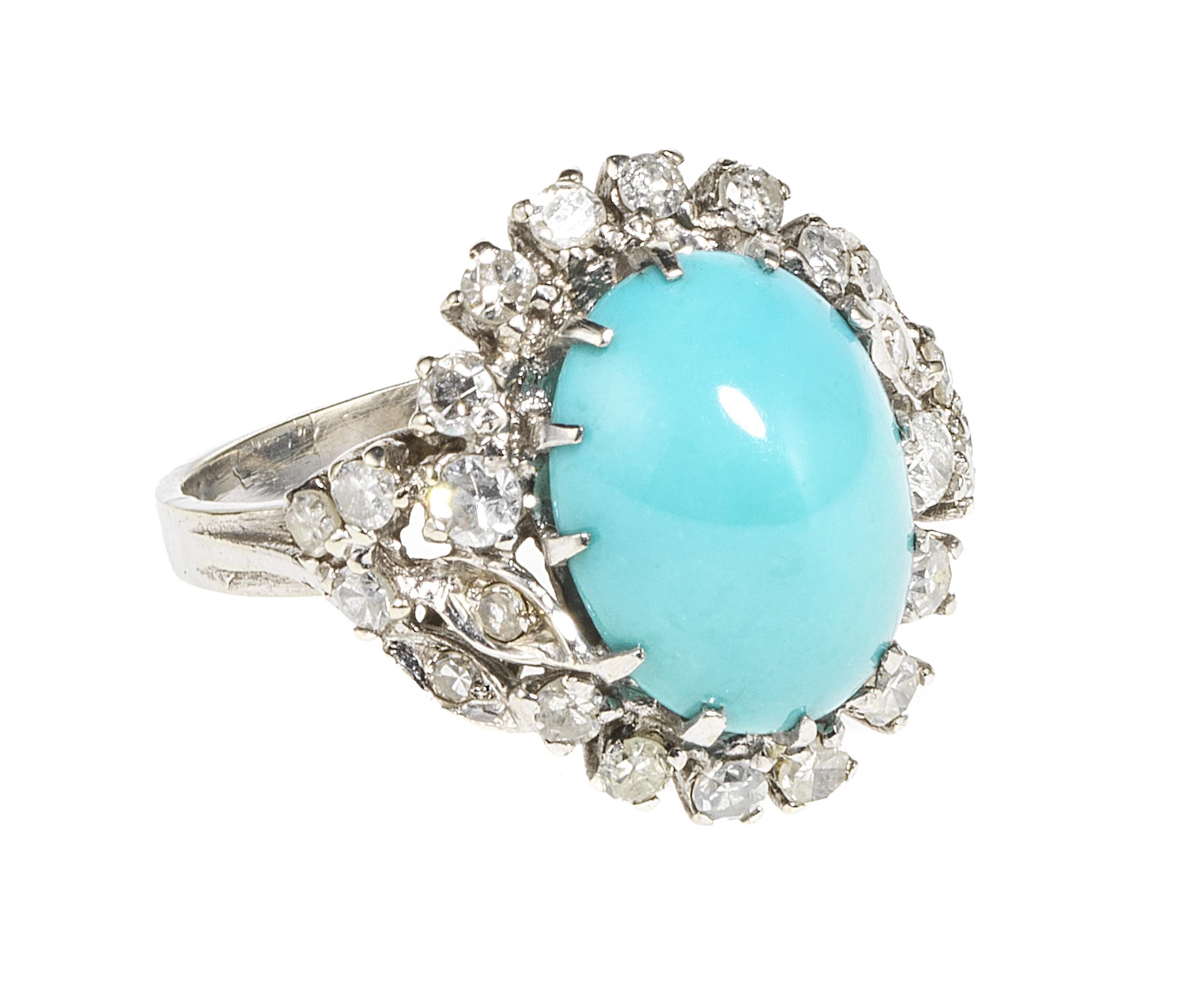 4090. Bague sertie d'une turquoise en pain de sucre entourée de diamants (env. 0,5 ct)