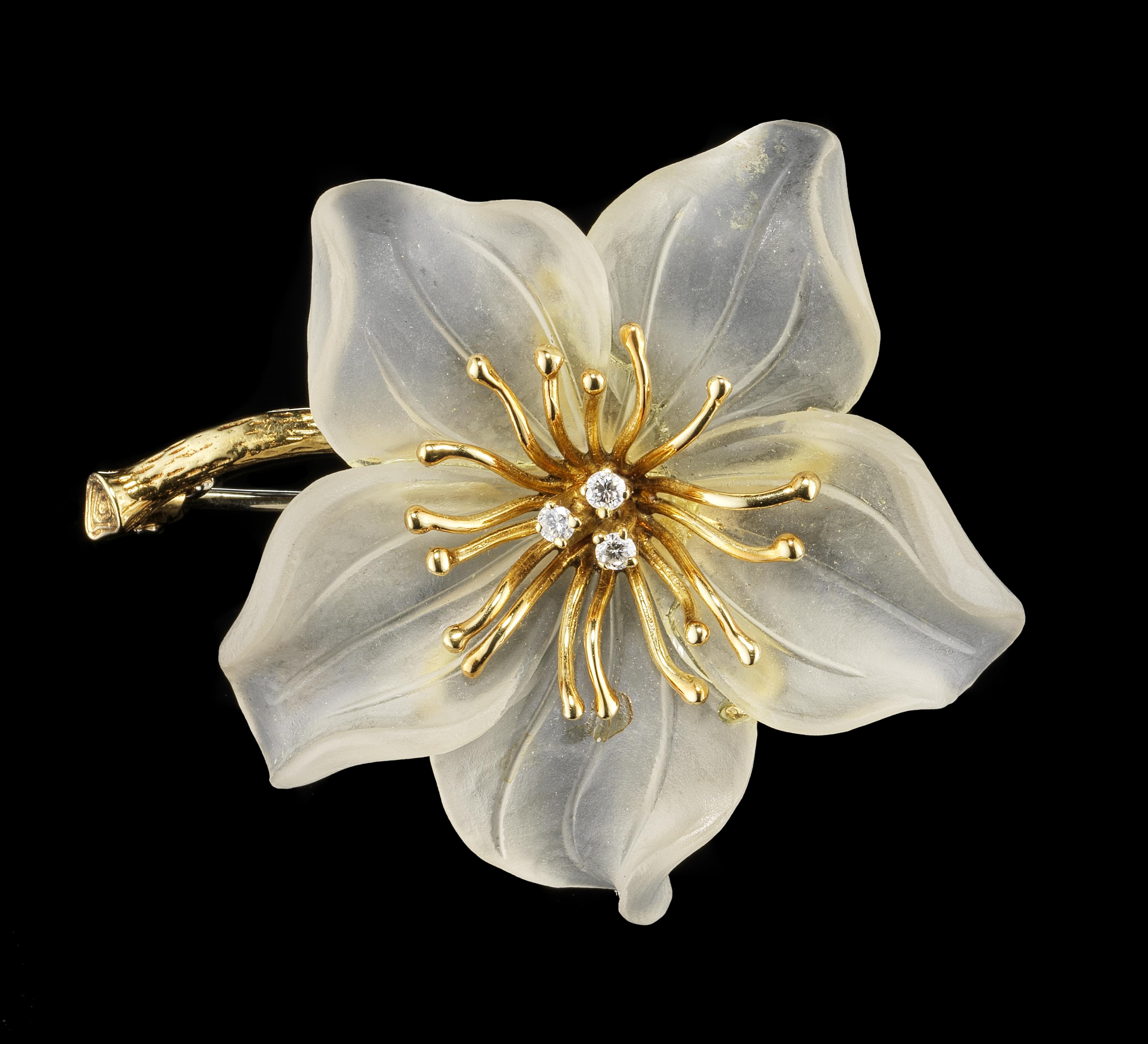 4095. Broche à motif de fleur sculptée en cristal de roche et centrée de diamants