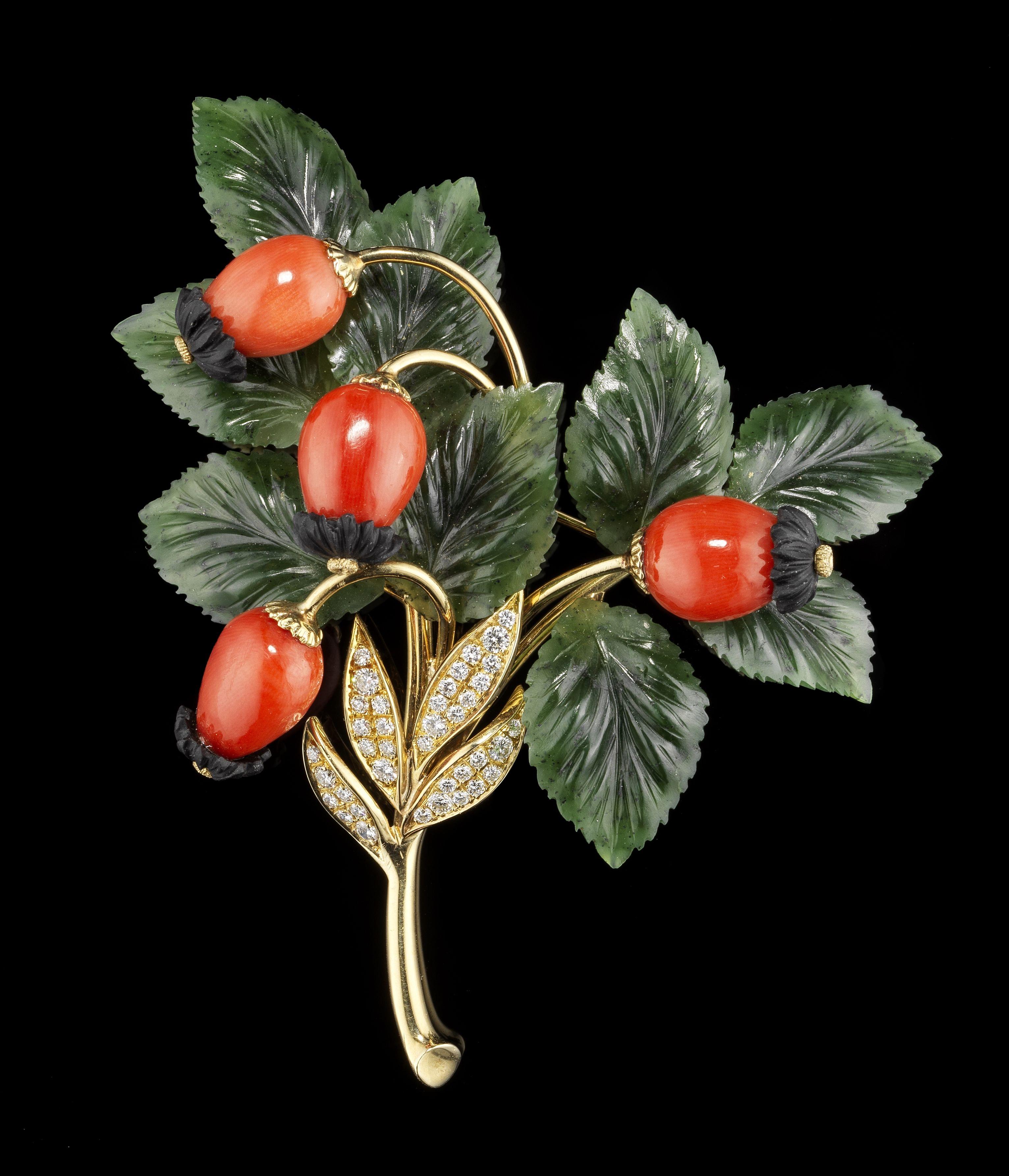 4107. Broche à motif de baies d'églantier en pierres dures sculptées